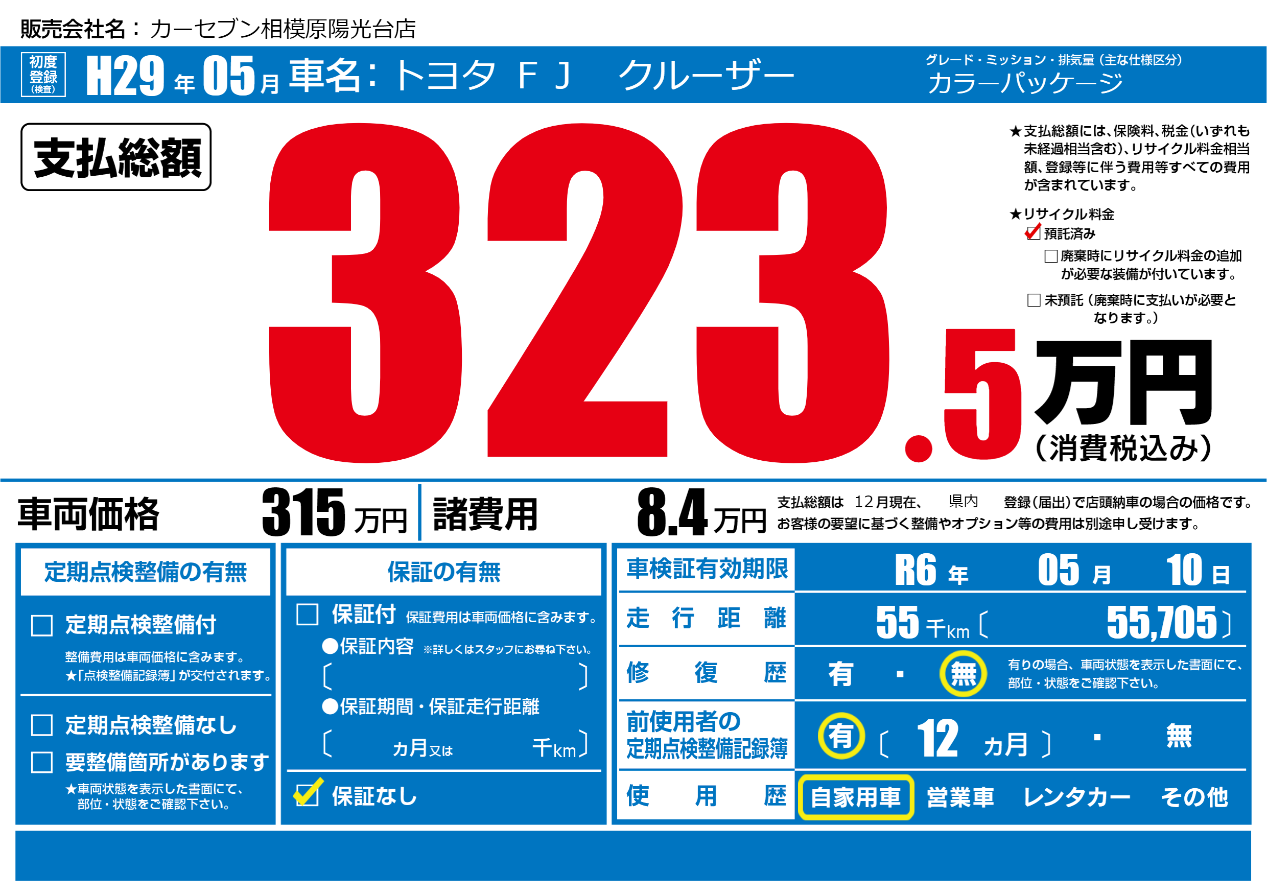 | 車名 | トヨタ FJ クルーザー | グレード ミッション 排気量 |