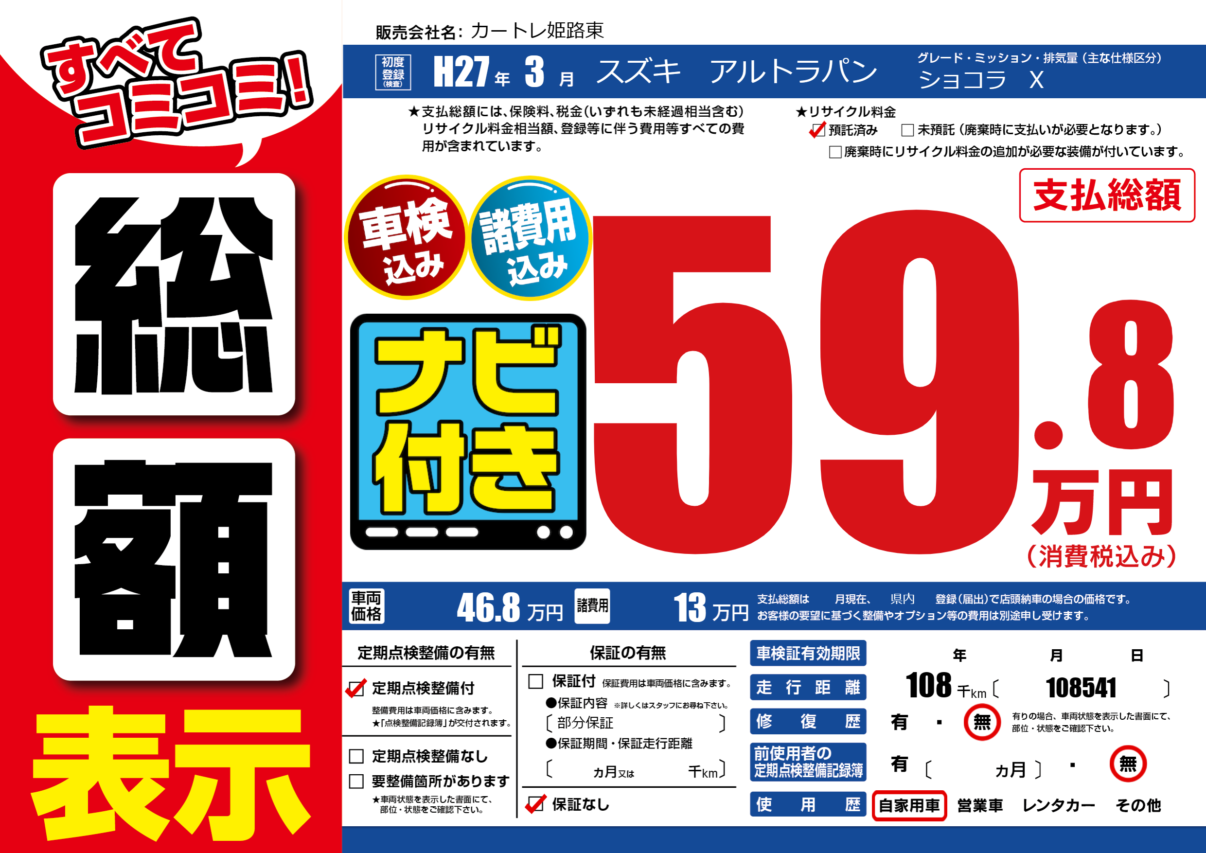 | 走行キロ | 10.8万km | 初年度登録 | H27年3月 |