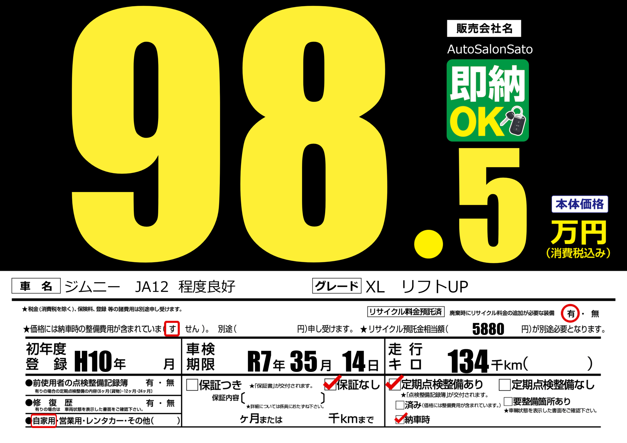 あり | リサイクル預託金相当額 | ( 5880円)が別途必要 |