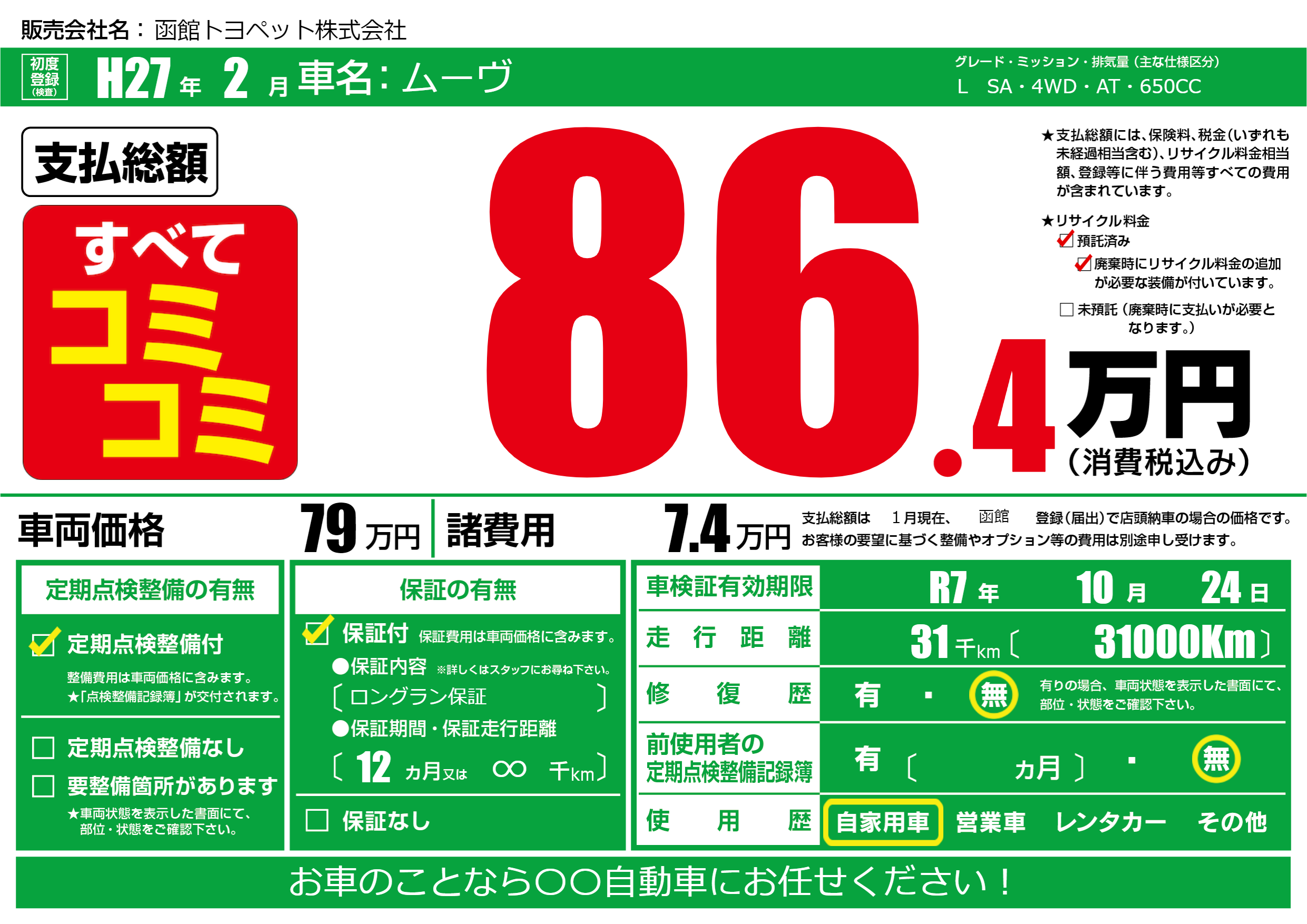 | 車名 | ムーヴ | グレード ミッション 排気量 |