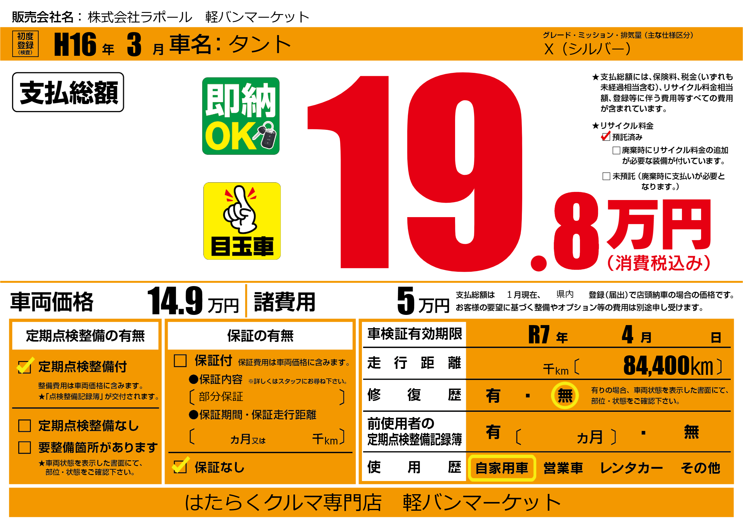 | 走行キロ | - | 初年度登録 | H16年3月 |