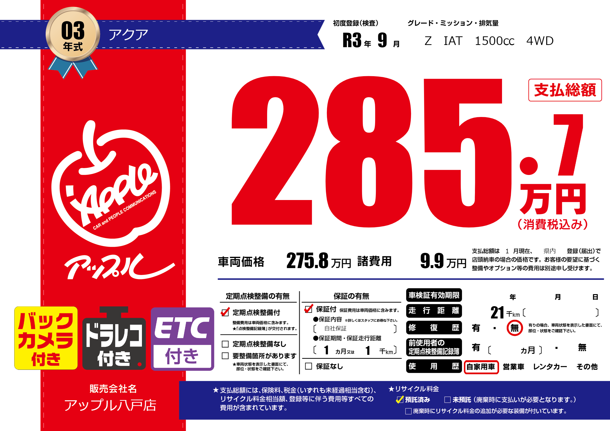| 初年度登録 | R3年9月 | ||