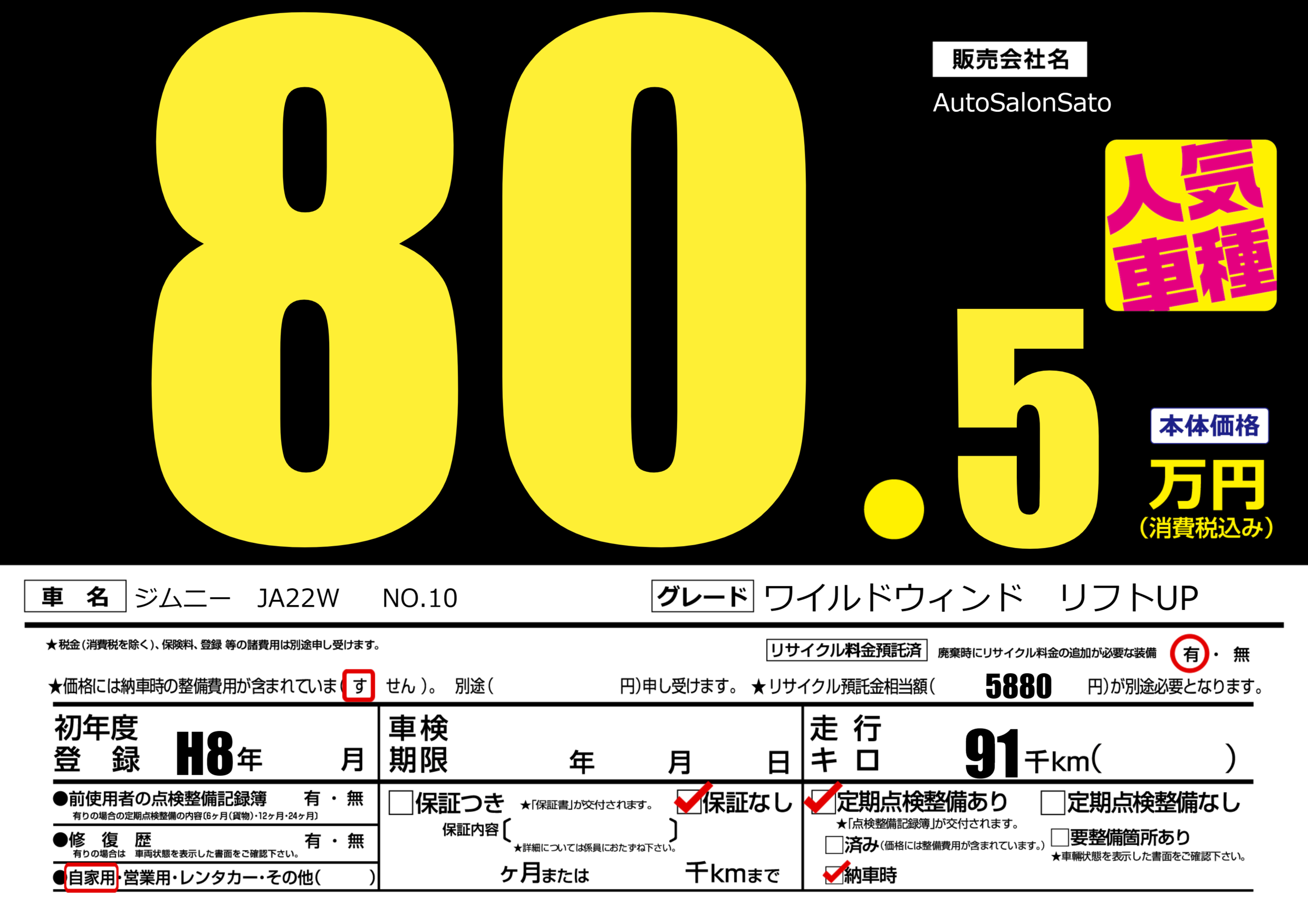 | 車名 | ジムニー JA22W NO.10 | グレード ミッション 排気量 |