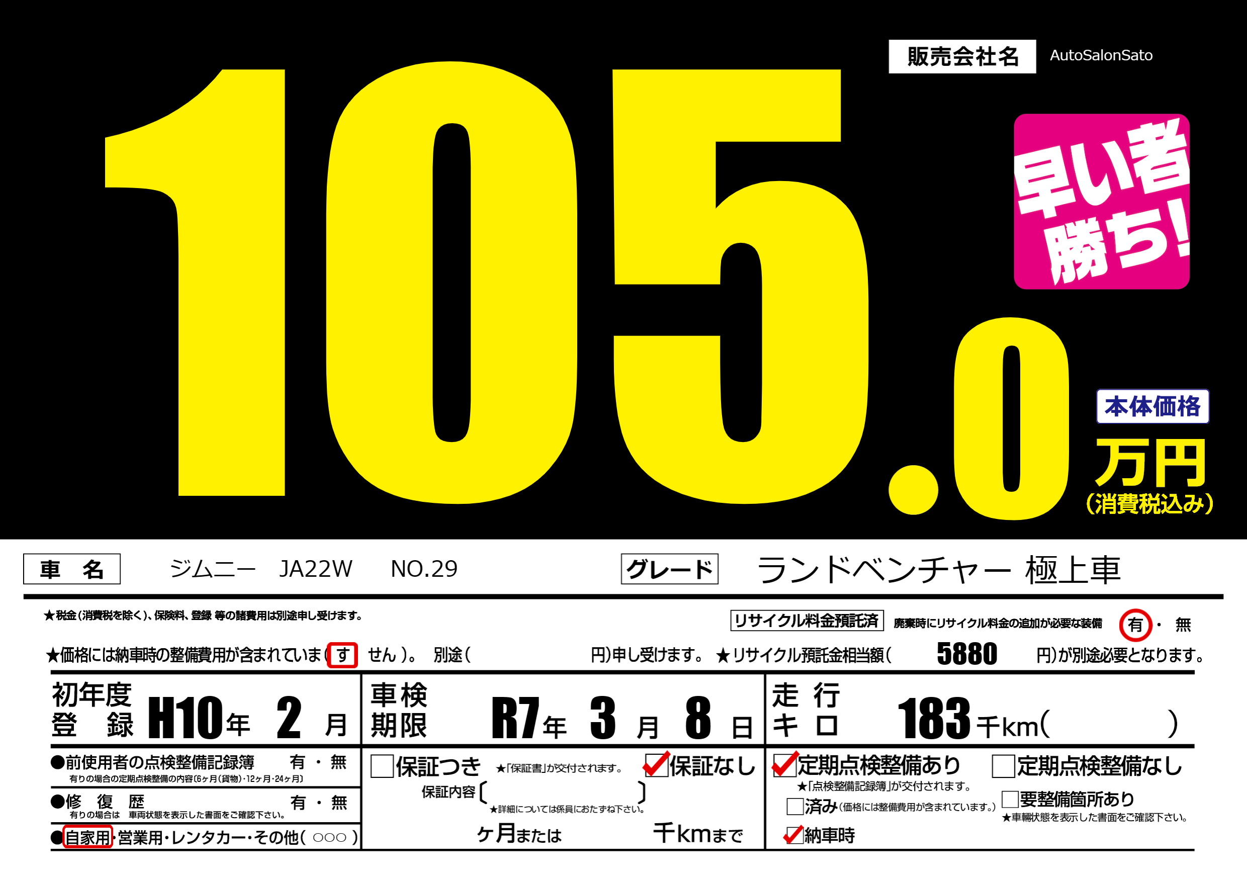 | 車名 | ジムニー JA22W NO.29 | グレード ミッション 排気量 |