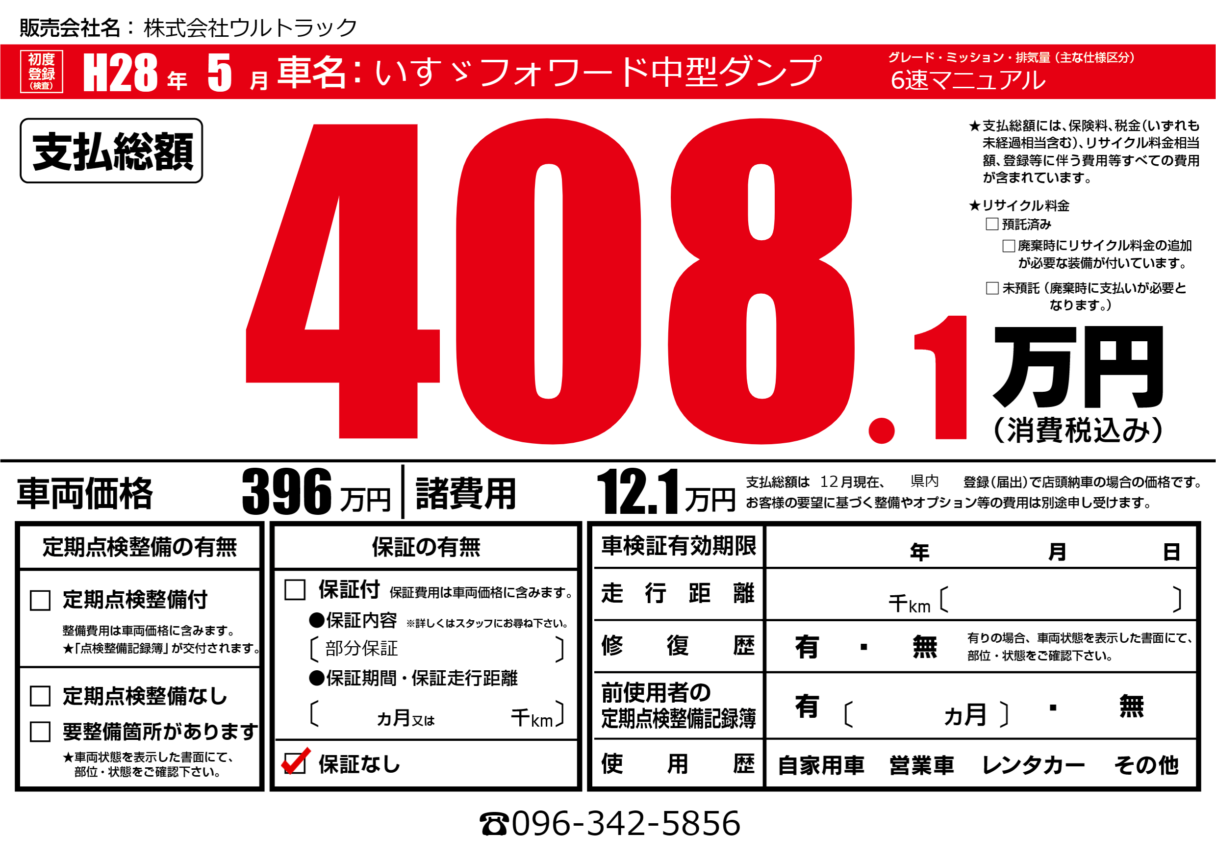 保証なし 保証内容(部分保証) ---ヶ月または()千kmまで |