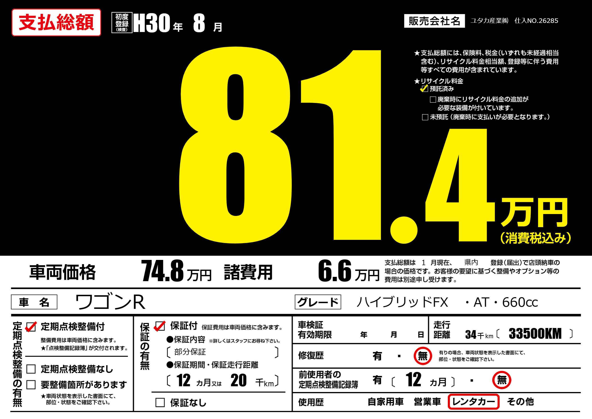 | 車名 | ワゴンR | グレード ミッション 排気量 |