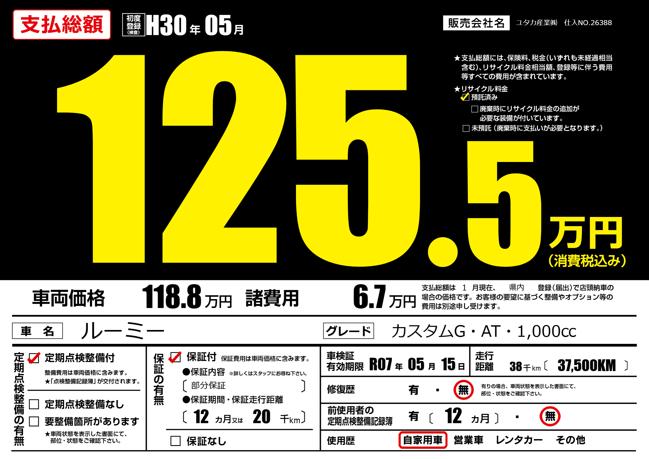 | 走行キロ | 3.8万km | 初年度登録 | H30年05月 |