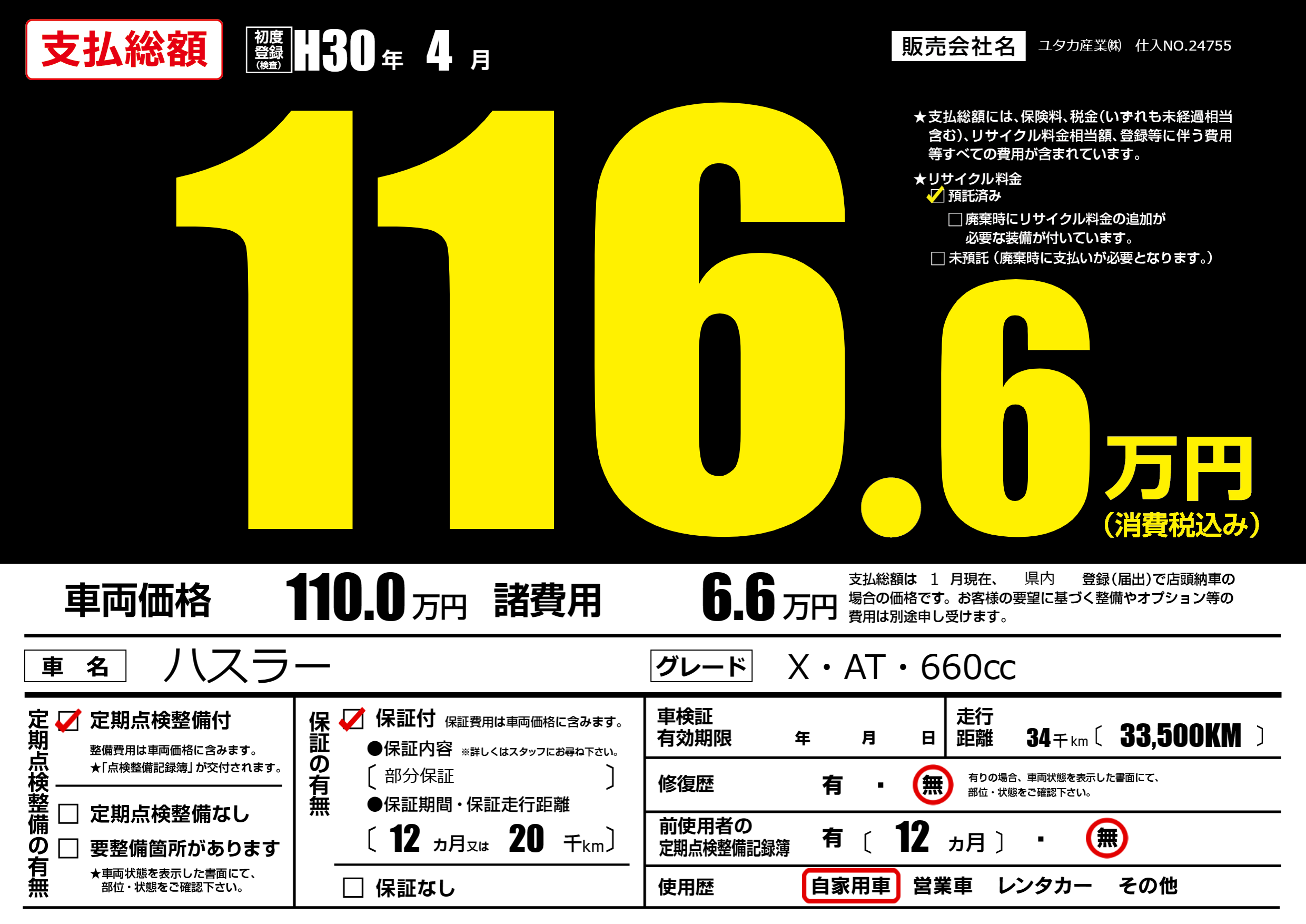 | 車名 | ハスラー | グレード ミッション 排気量 |