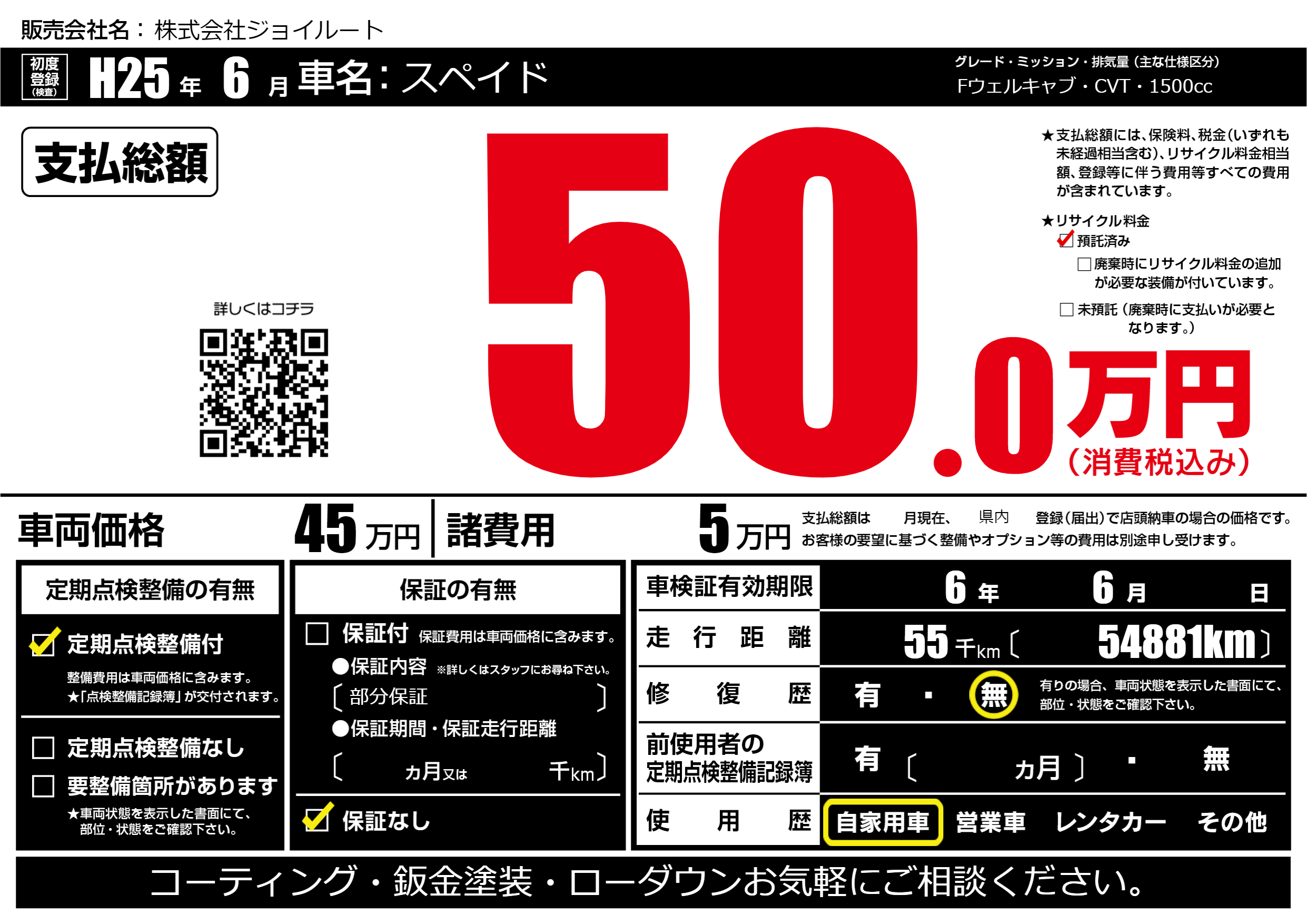 | 走行キロ | 5.5万km | 初年度登録 | H25年6月 |