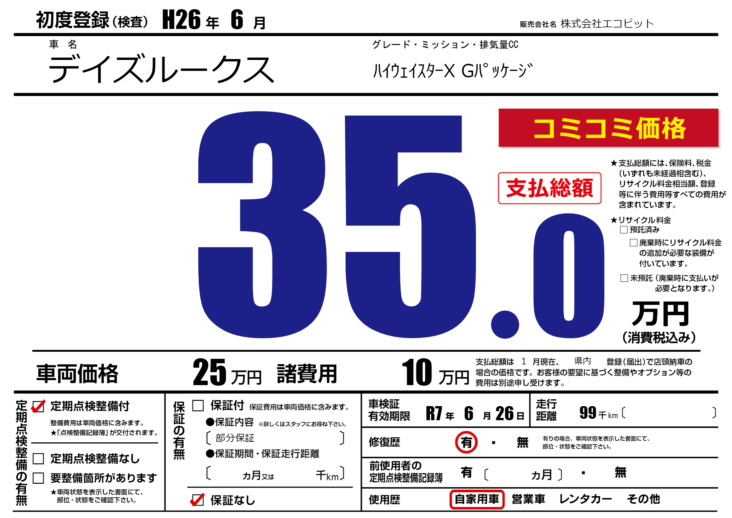 | 走行キロ | 9.9万km | 初年度登録 | H26年6月 |