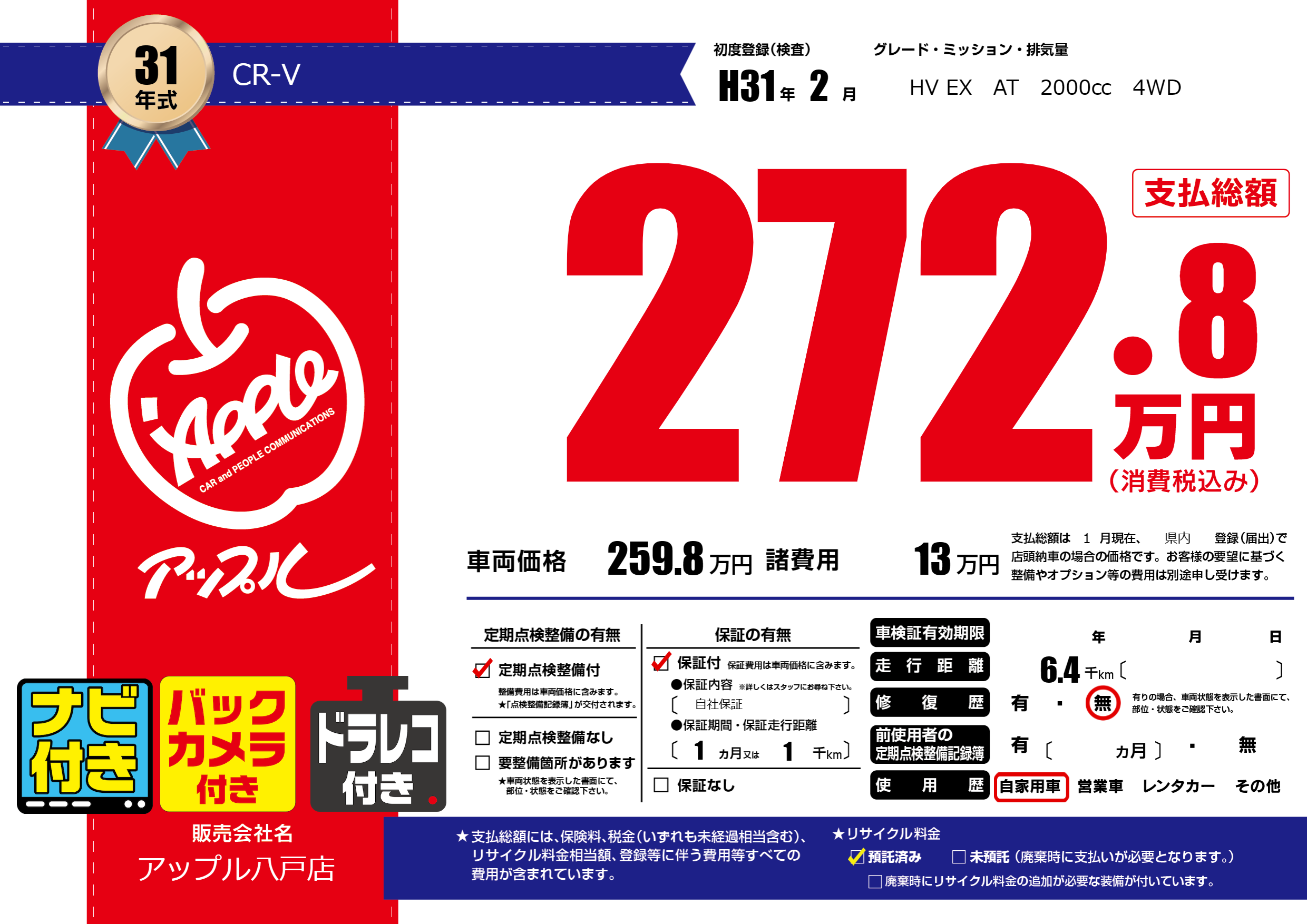 保証付き 保証内容( 自社保証) 1ヶ月または(1)千kmまで |