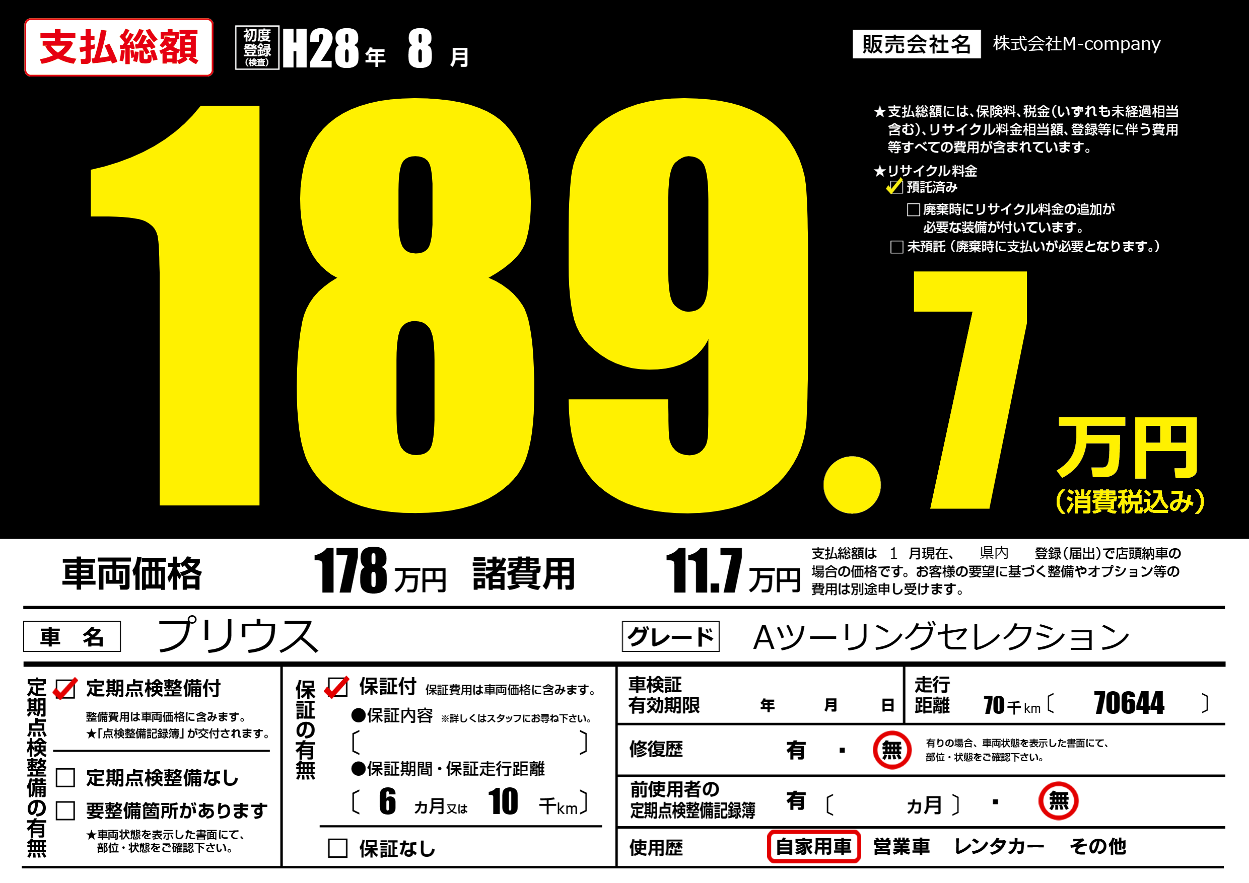 | 車名 | プリウス | グレード ミッション 排気量 |