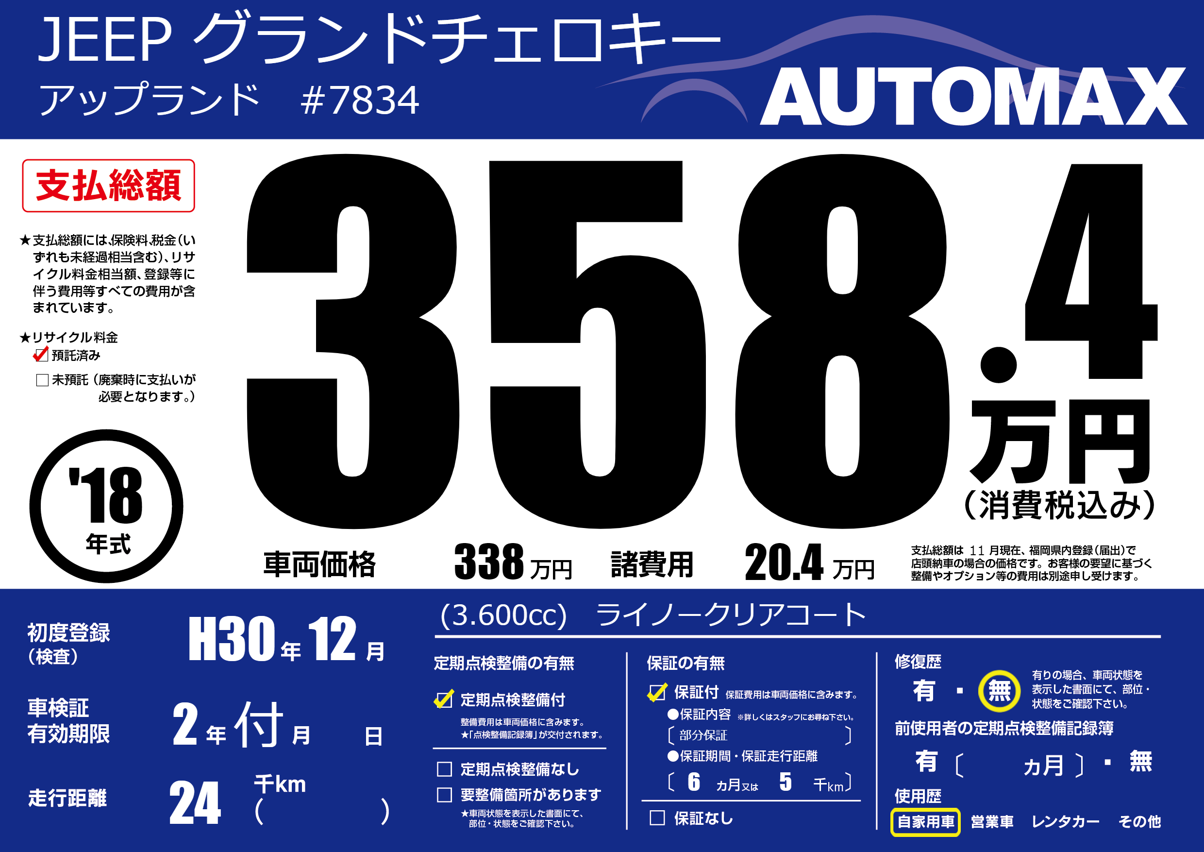 | 車名 | JEEP グランドチェロキー | グレード ミッション 排気量 |
