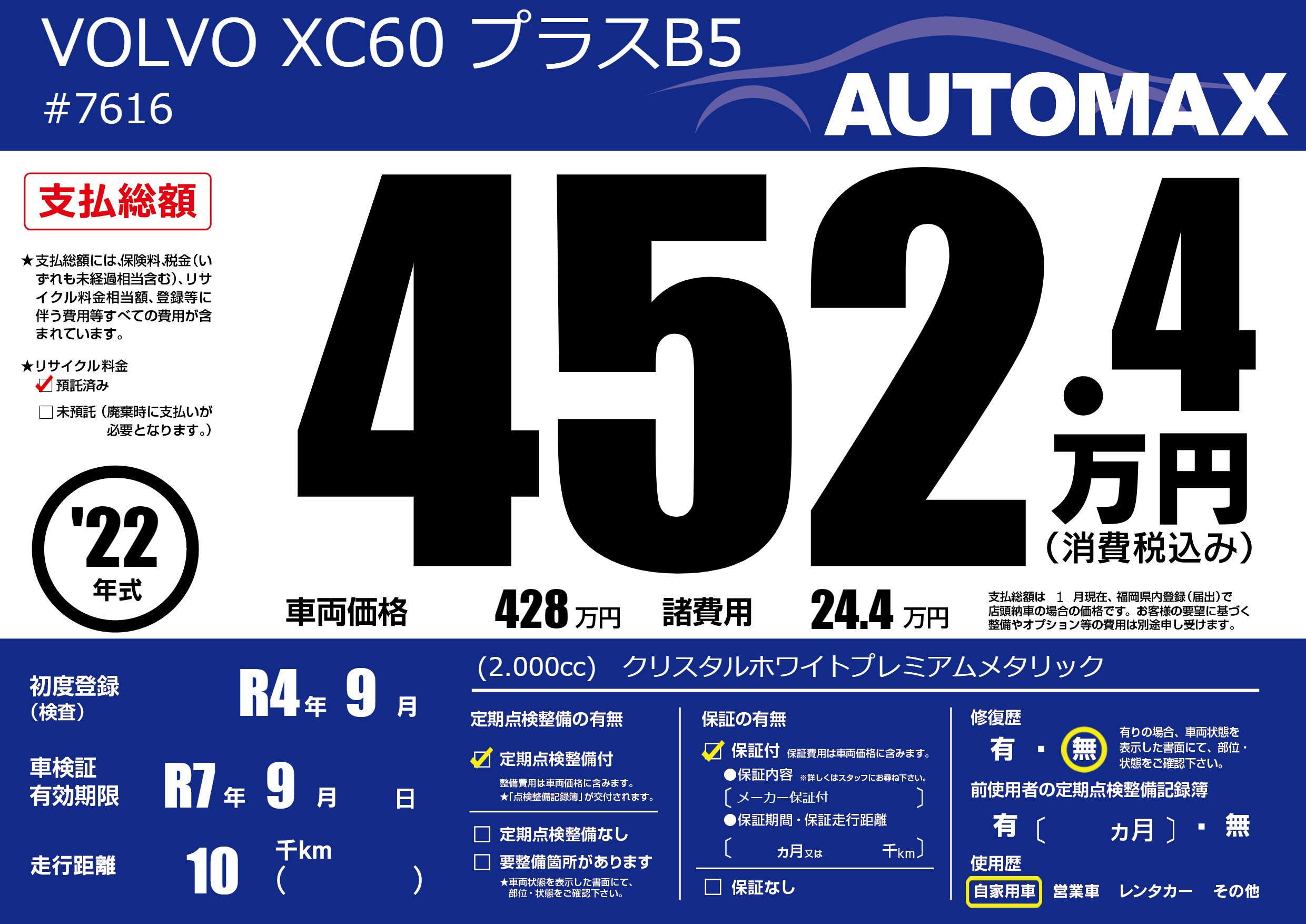 | 車名 | VOLVO XC60 プラスB5 | グレード ミッション 排気量 |