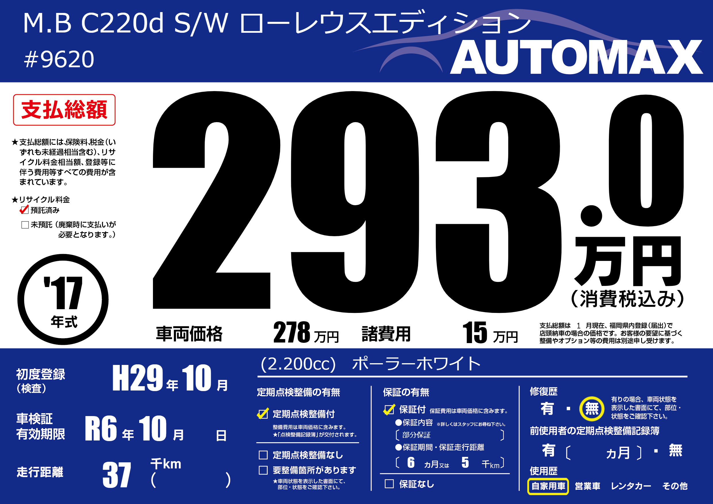 | 車名 | M.B C220d S/W ローレウスエディション | グレード ミッション 排気量 |