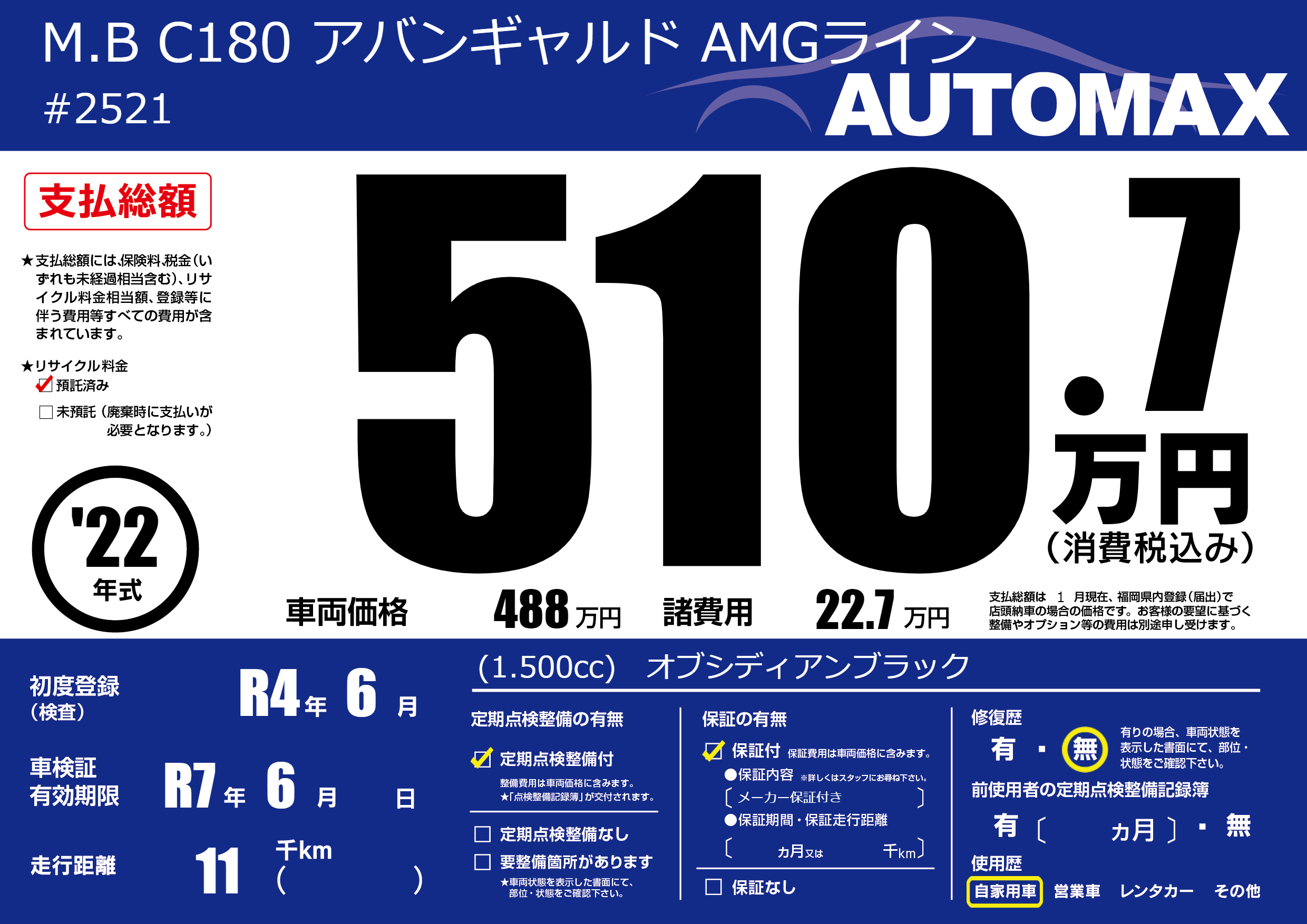 | 車名 | M.B C180 アバンギャルド AMGライン | グレード ミッション 排気量 |