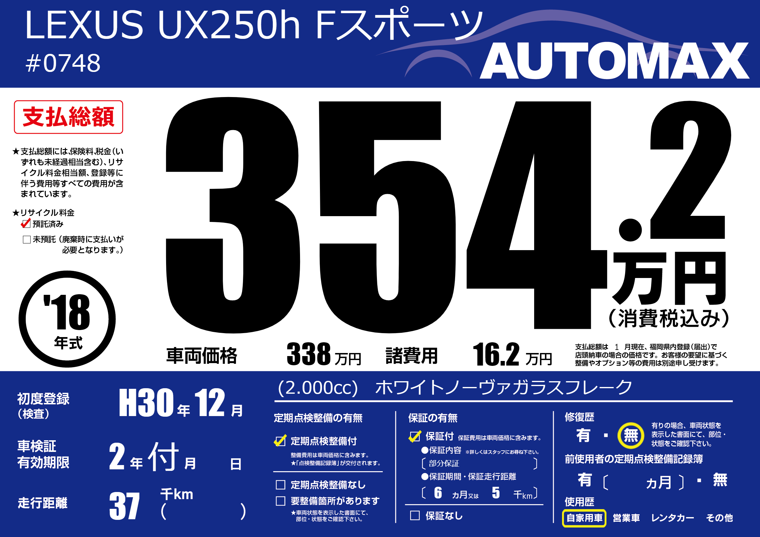 | 車名 | LEXUS UX250h Fスポーツ | グレード ミッション 排気量 |