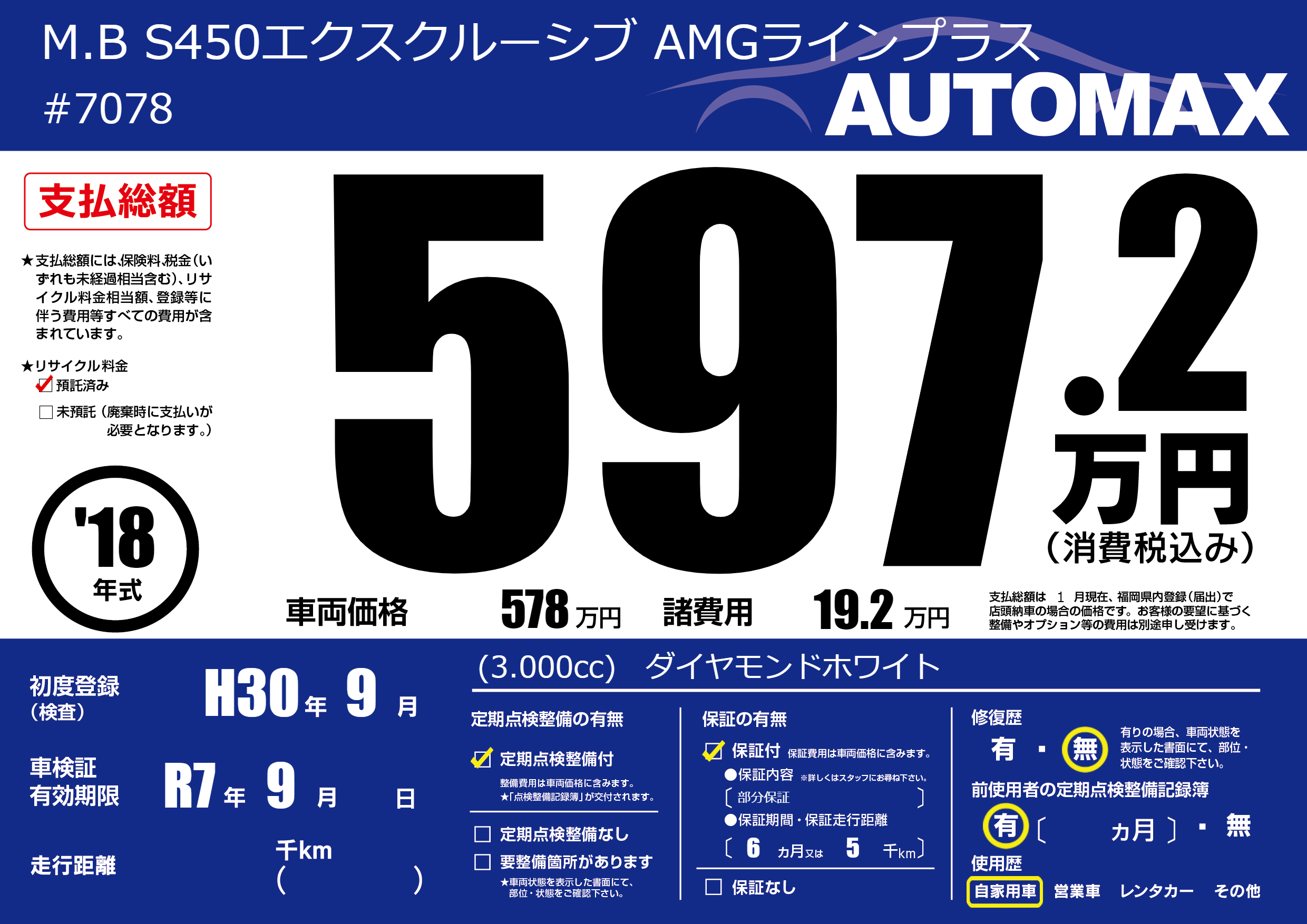 | 車名 | M.B S450エクスクルーシブ AMGラインプラス | グレード ミッション 排気量 |