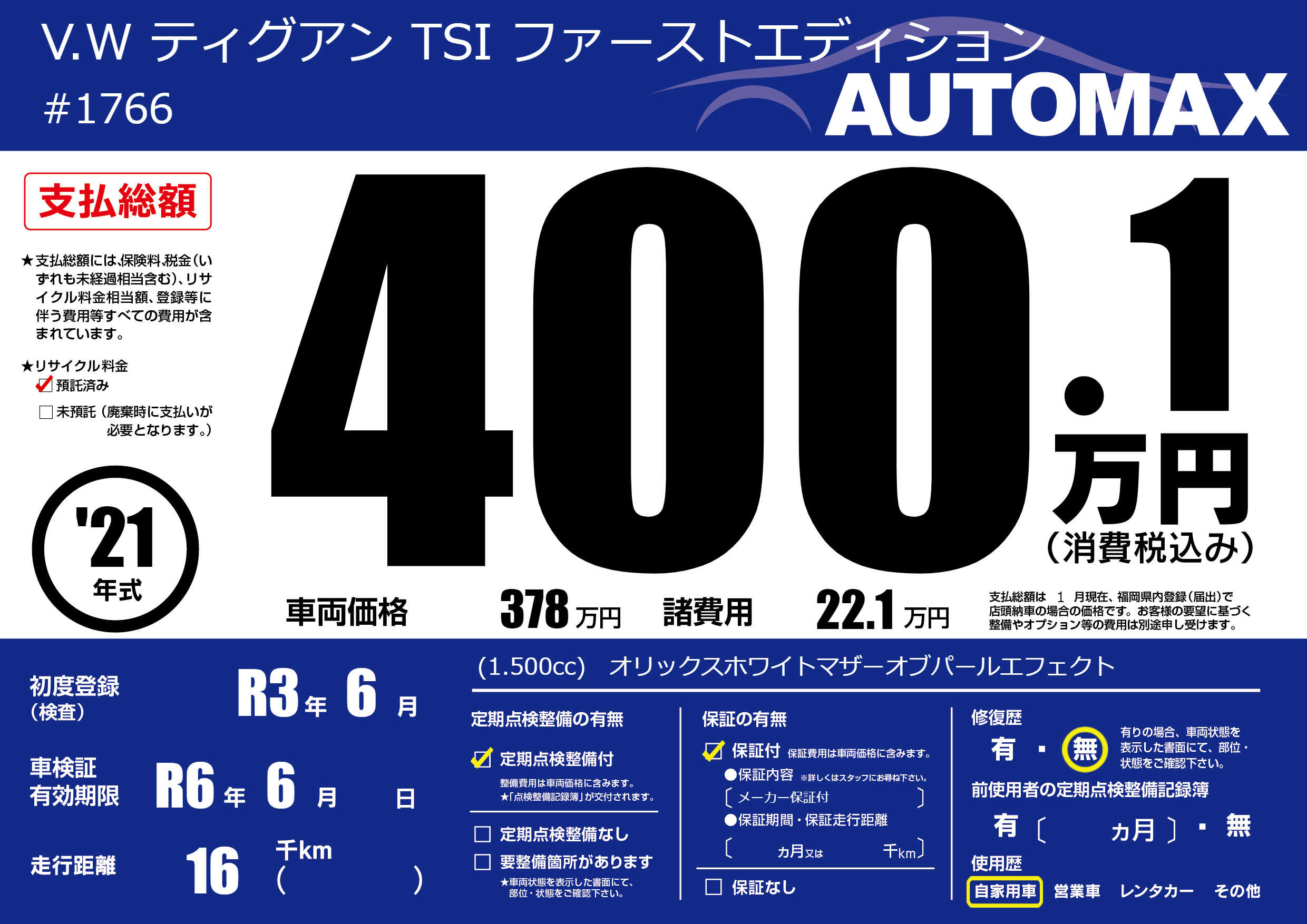 | 走行キロ | 1.6万km | 初年度登録 | R3年6月 |
