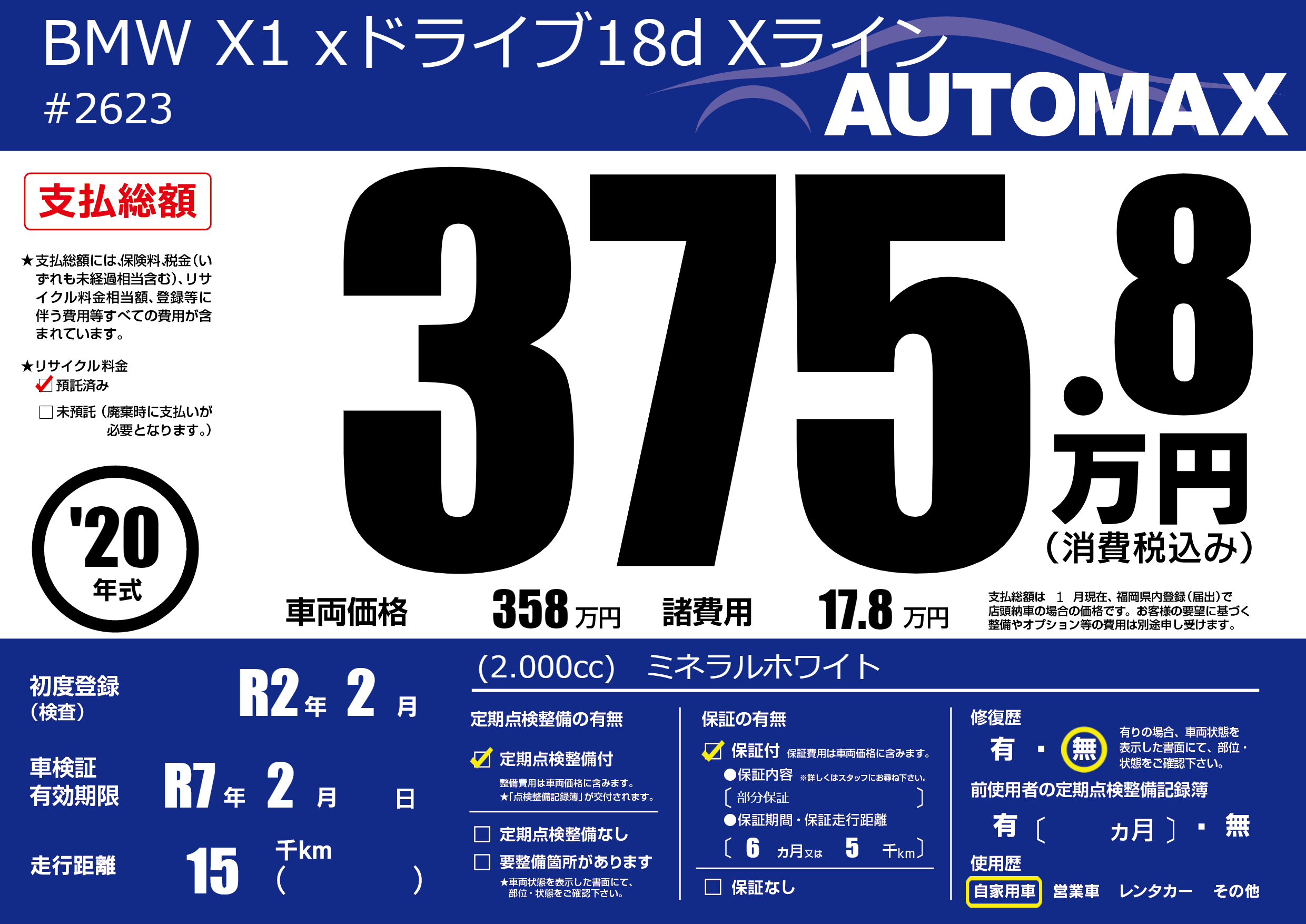 | 車名 | BMW X1 xドライブ18d Xライン | グレード ミッション 排気量 |