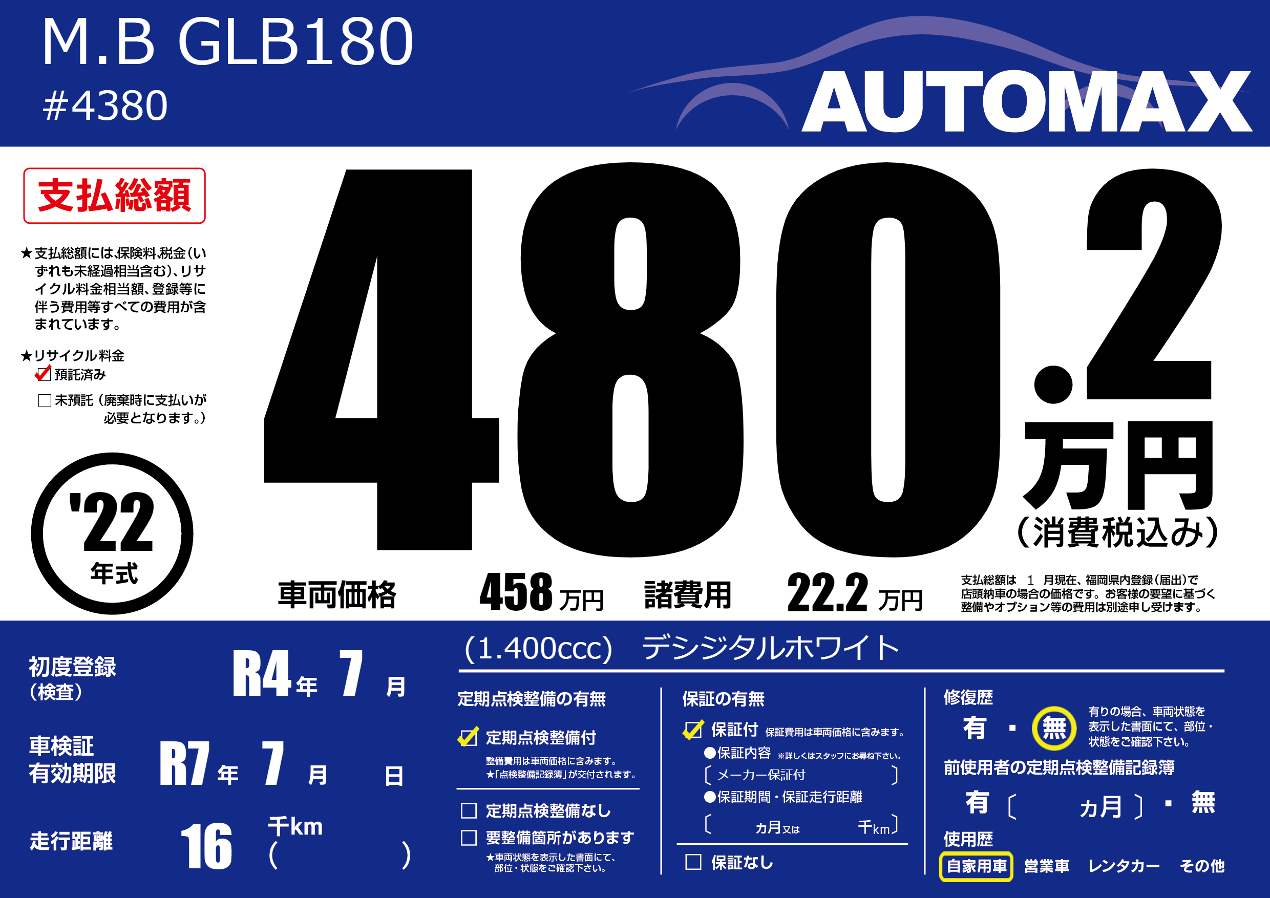 | 車名 | M.B GLB180 | グレード ミッション 排気量 |