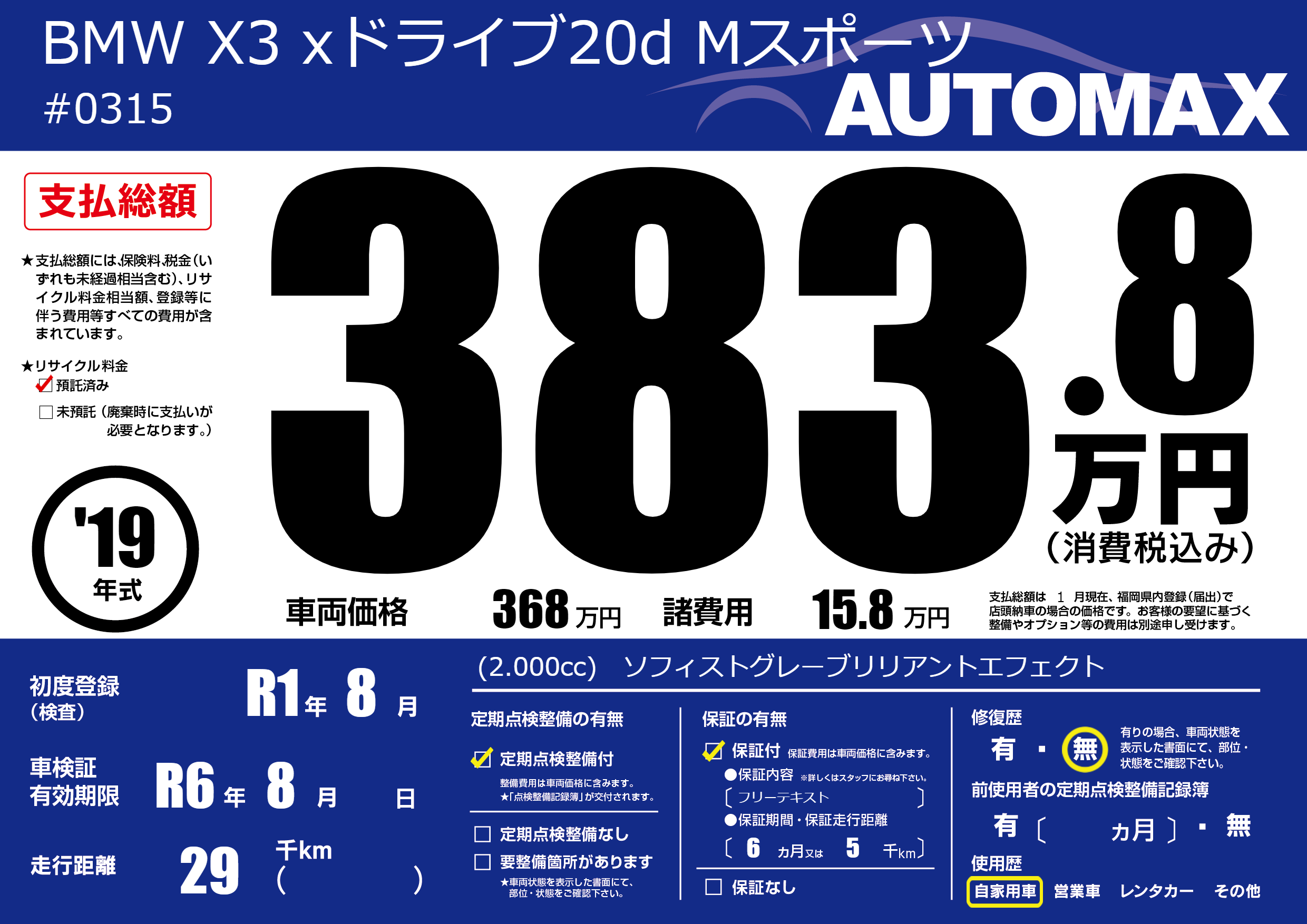 | 車名 | BMW X3 xドライブ20d Mスポーツ | グレード ミッション 排気量 |