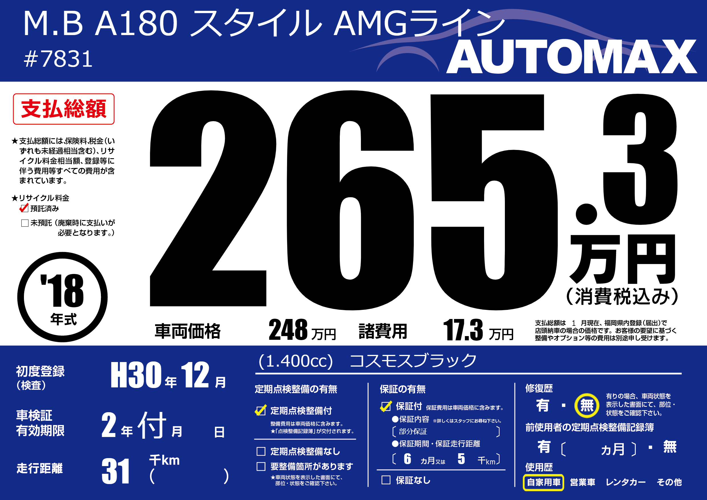 | 車名 | M.B A180 スタイル AMGライン | グレード ミッション 排気量 |
