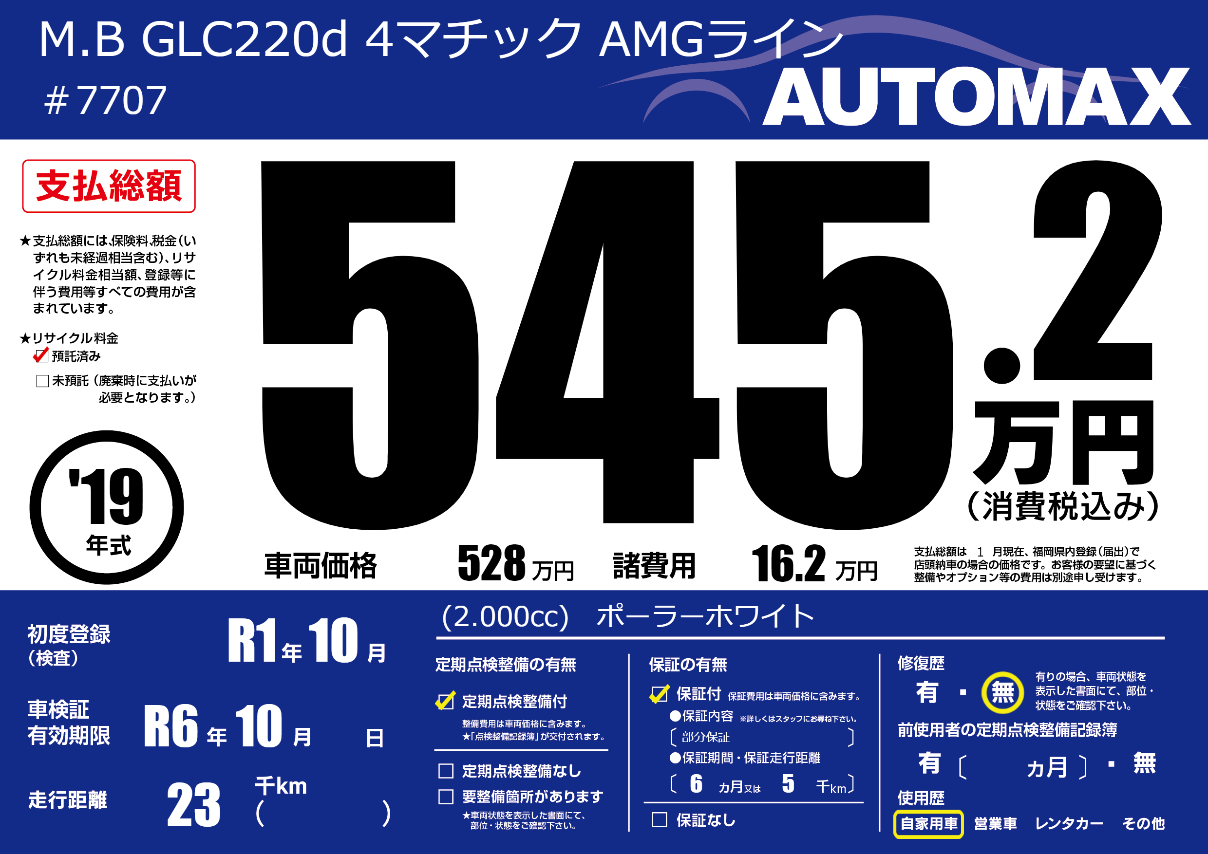 | 車名 | M.B GLC220d 4マチック AMGライン | グレード ミッション 排気量 |