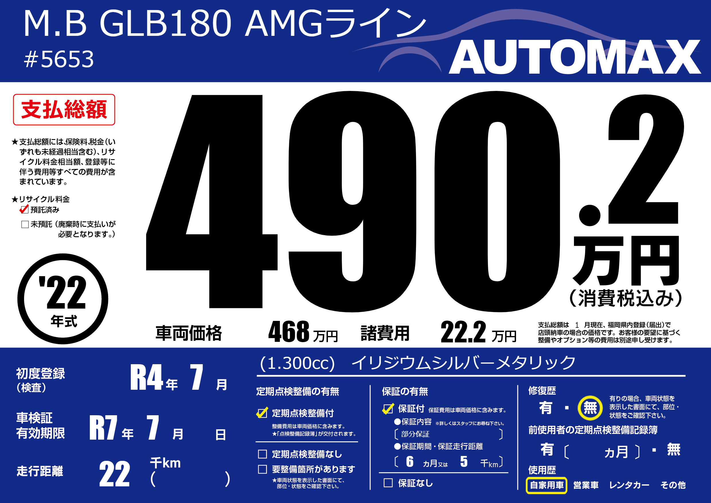 | 車名 | M.B GLB180 AMGライン | グレード ミッション 排気量 |
