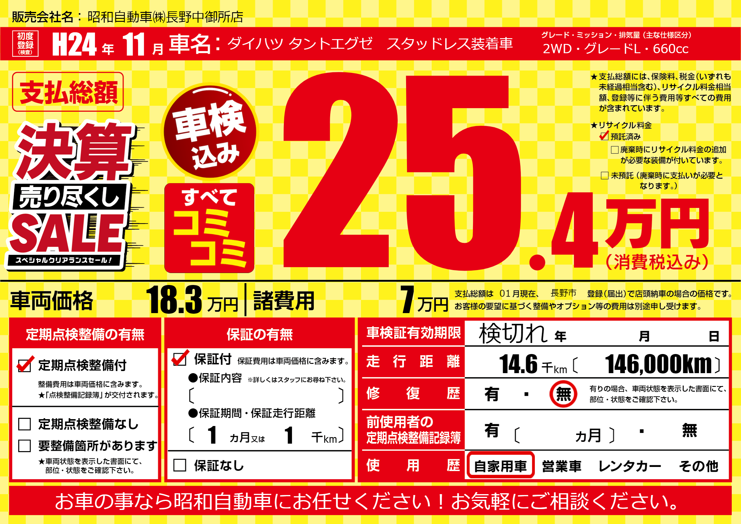 | 車名 | ダイハツ タントエグゼ スタッドレス装着車 | グレード ミッション 排気量 |