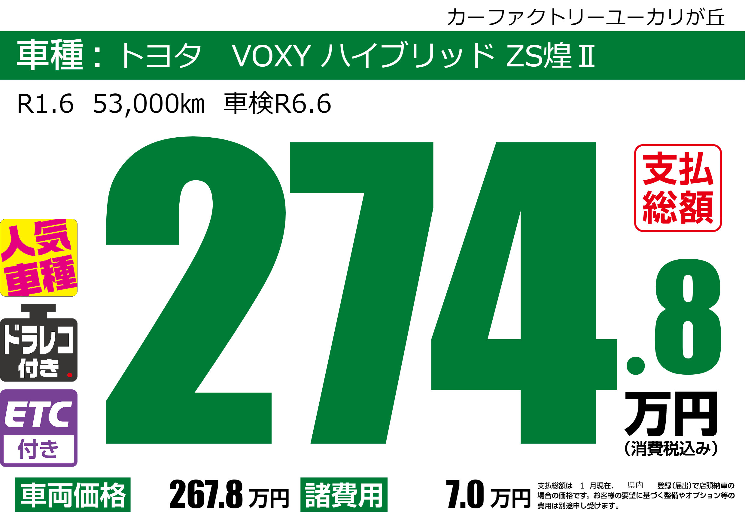 | 車名 | トヨタ VOXY ハイブリッド ZS煌Ⅱ | グレード ミッション 排気量 |