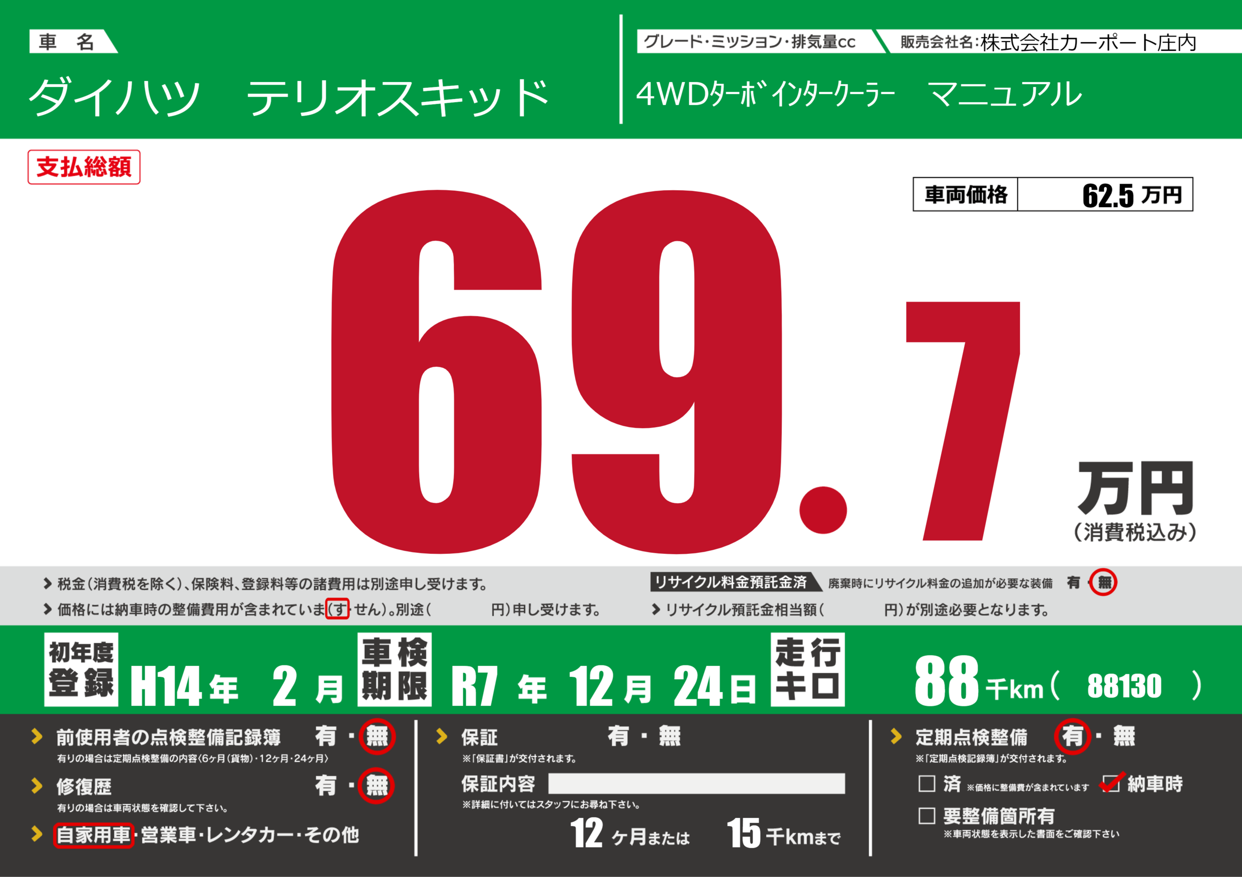 | 定期点検整備 | 定期点検整備あり 納車時あり | ||