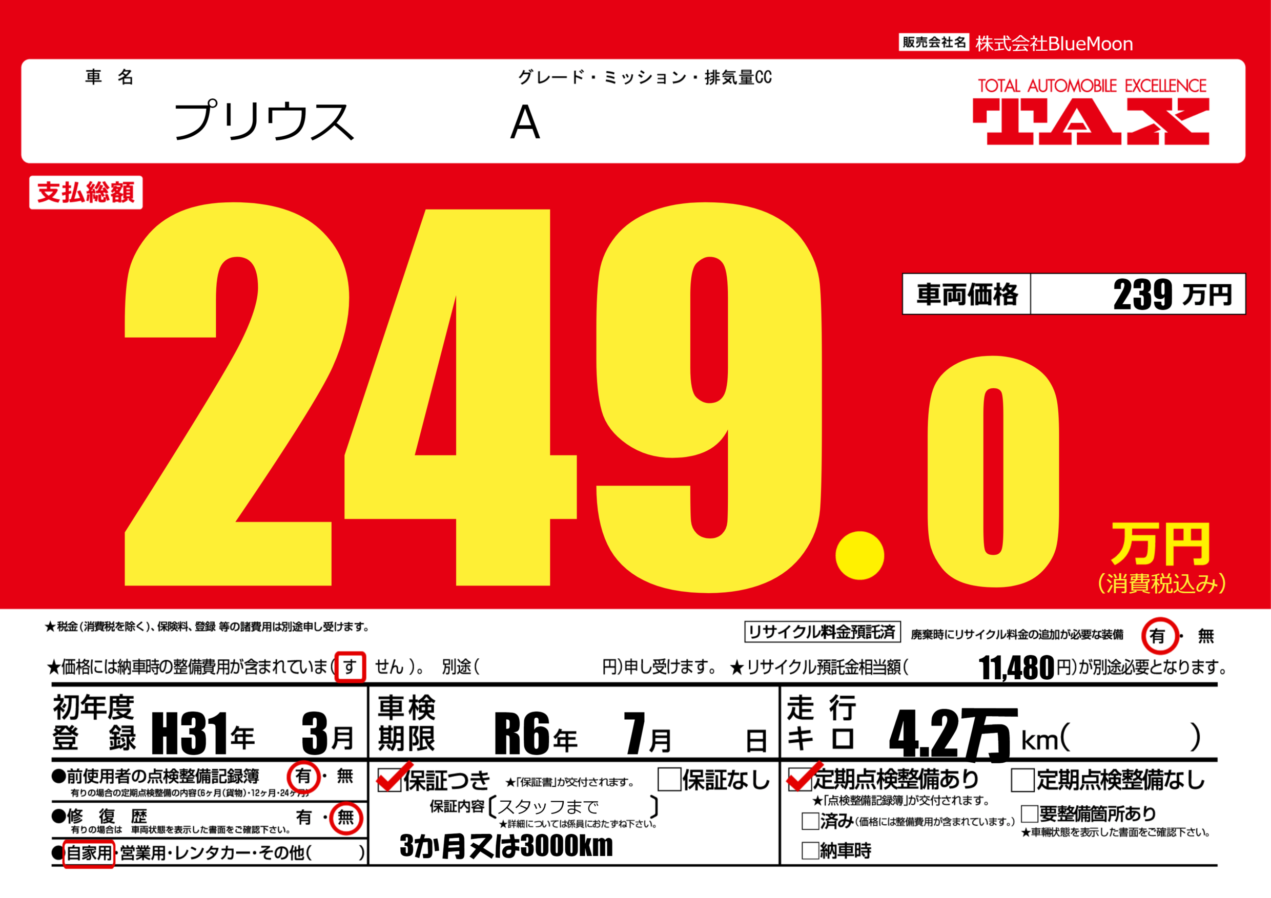 | 車名 | プリウス | グレード ミッション 排気量 |