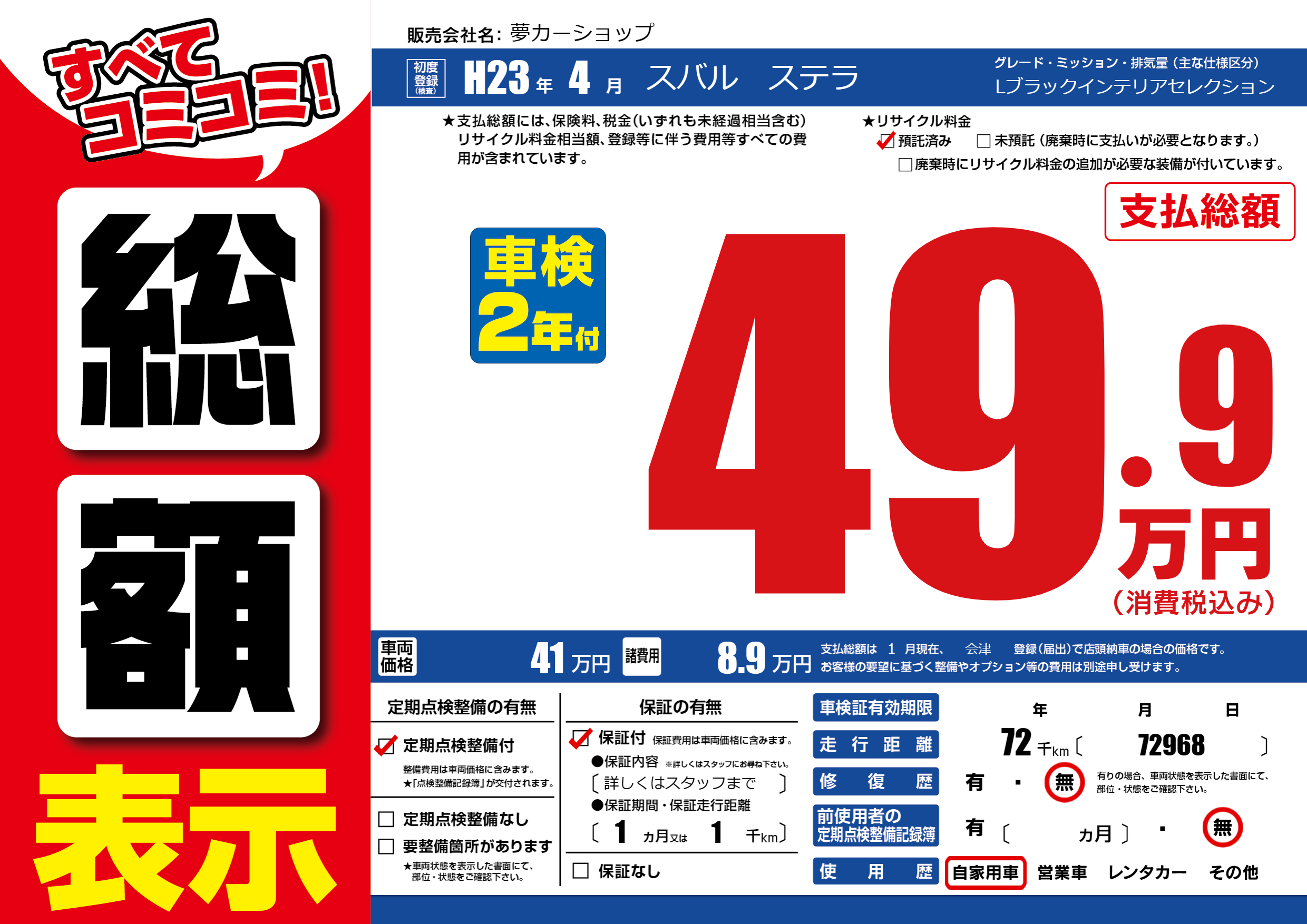| 走行キロ | 7.2万km | 初年度登録 | H23年4月 |