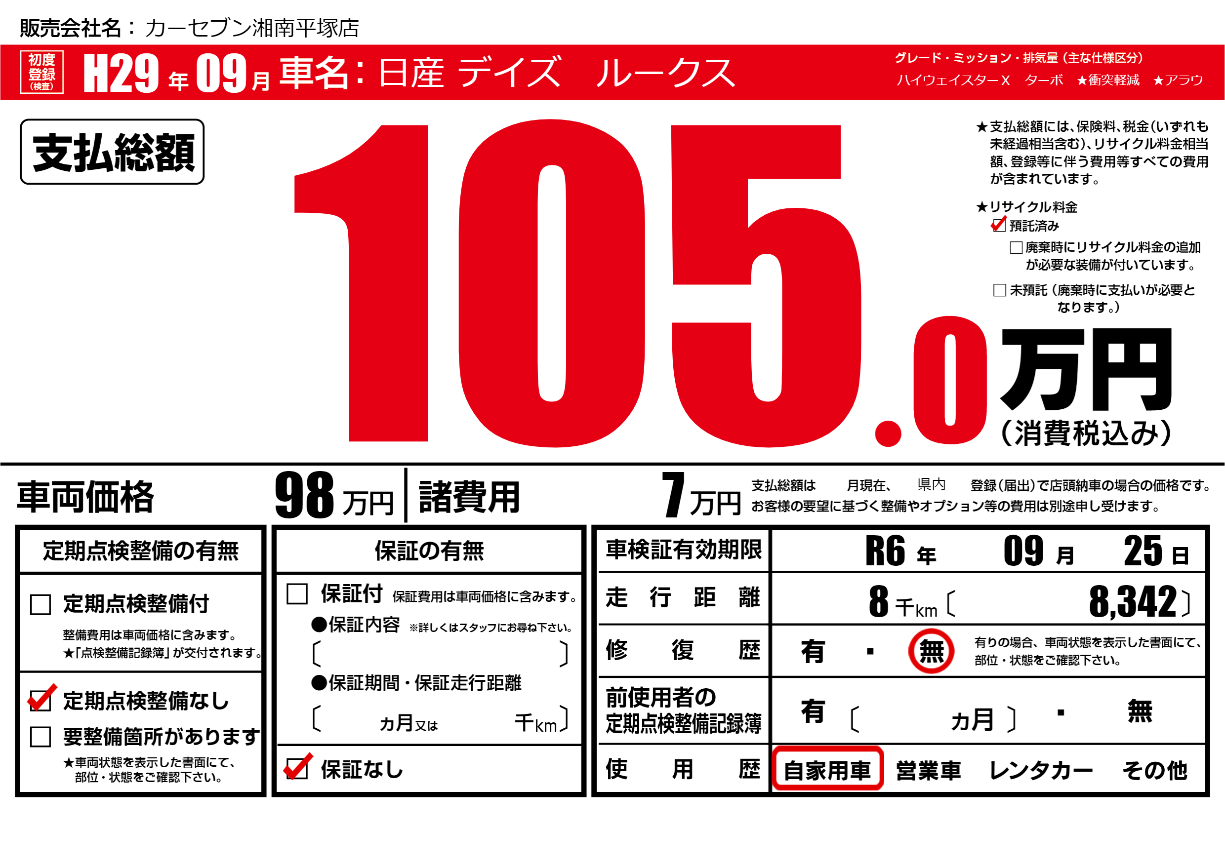| 走行キロ | 0.8万km | 初年度登録 | H29年09月 |