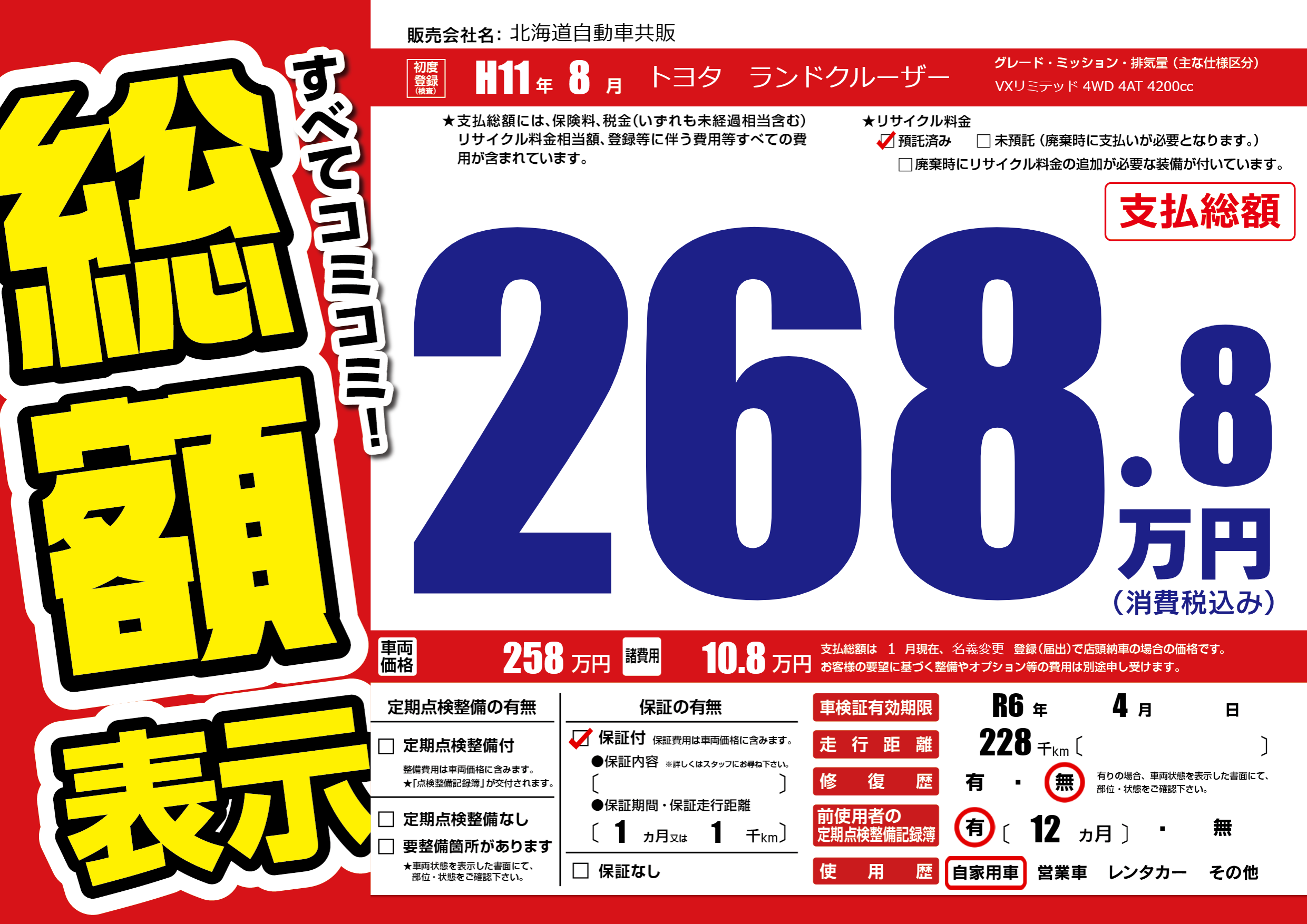 | 走行キロ | 22.8万km | 初年度登録 | H11年8月 |