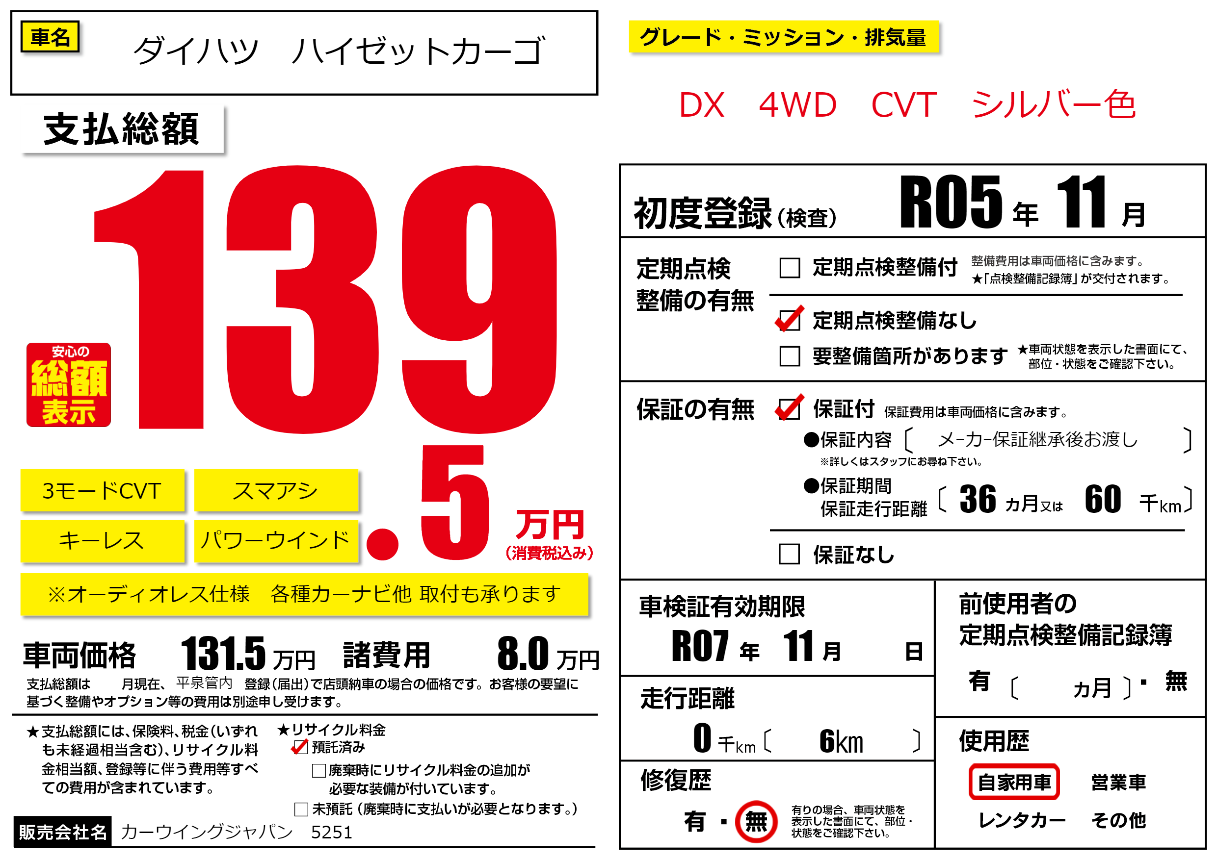 | 車名 | ダイハツ ハイゼットカーゴ | グレード ミッション 排気量 |