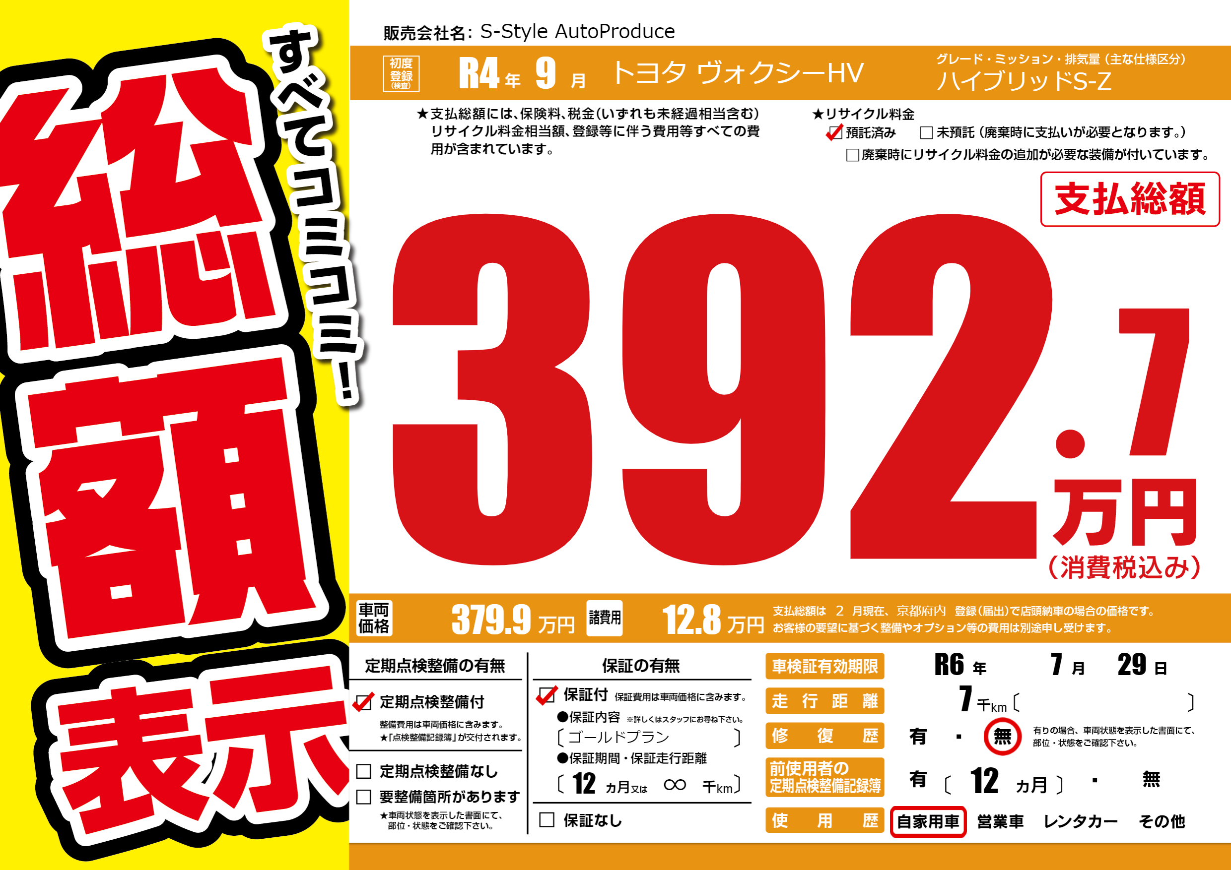 | 車名 | トヨタ ヴォクシーHV | グレード ミッション 排気量 |
