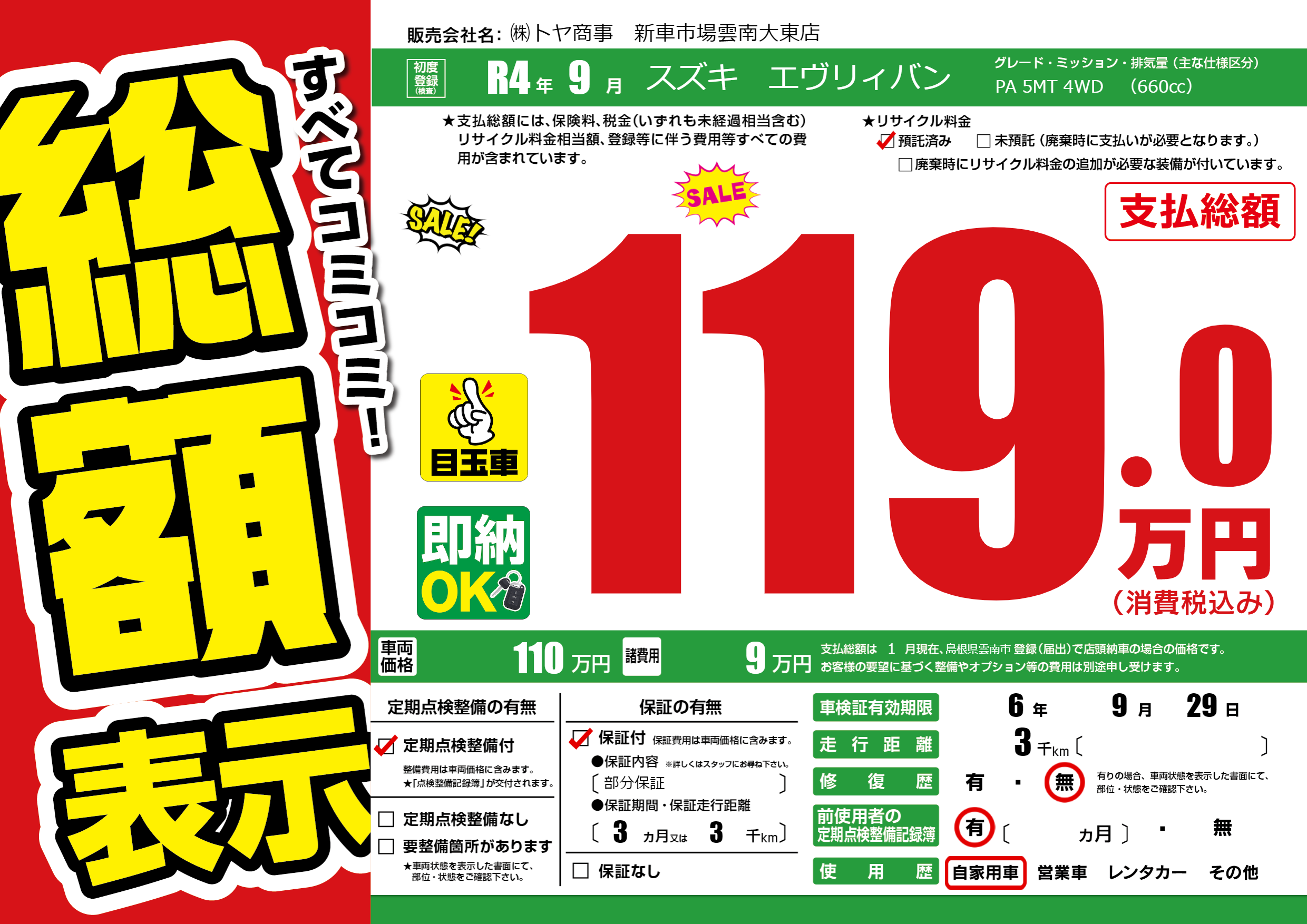 | 車名 | スズキ エヴリィバン | グレード ミッション 排気量 |