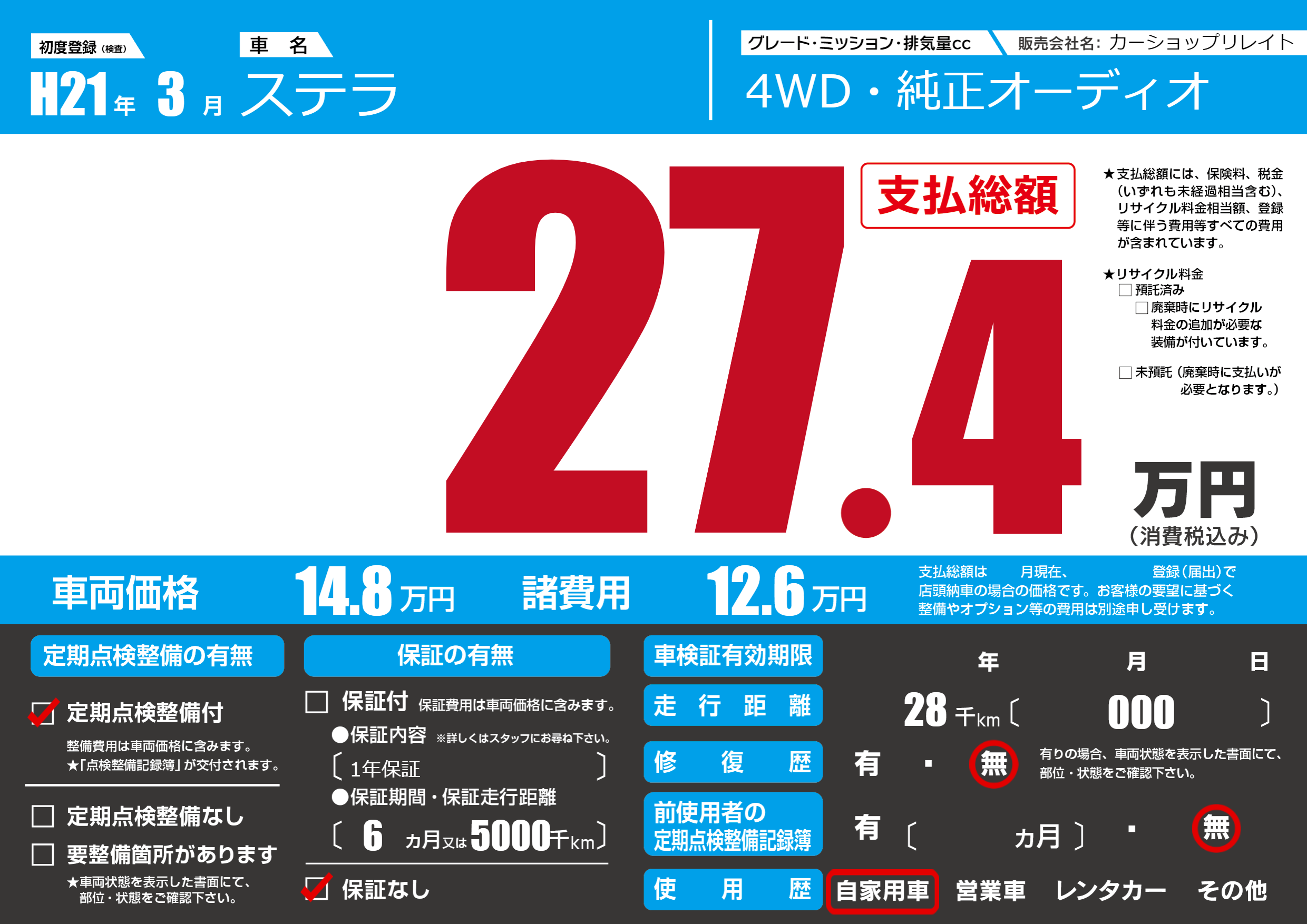 | 車名 | ステラ | グレード ミッション 排気量 |