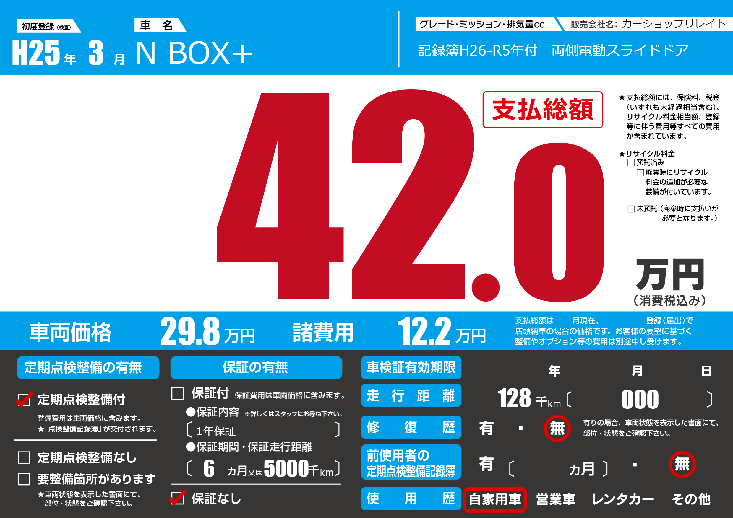 | 走行キロ | 12.8万km | 初年度登録 | H25年3月 |