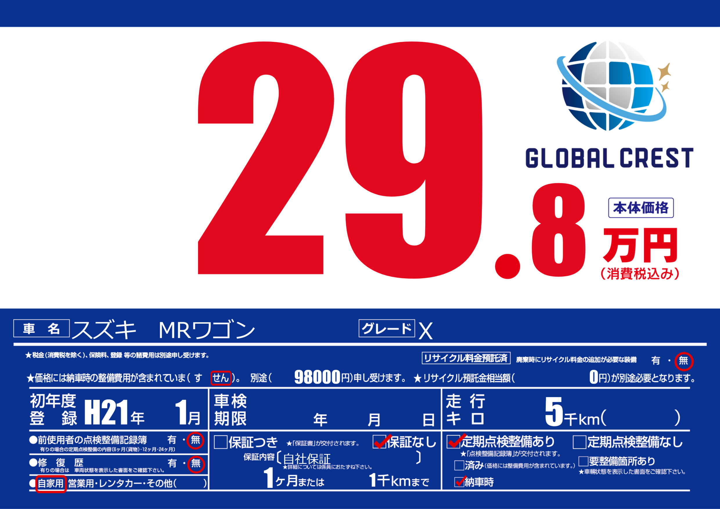 | 走行キロ | 0.5万km | 初年度登録 | H21年1月 |