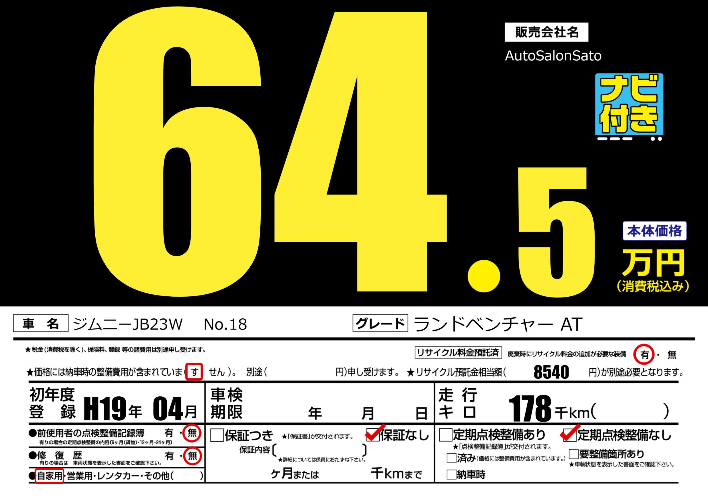 | 車名 | ジムニーJB23W No.18 | グレード ミッション 排気量 |