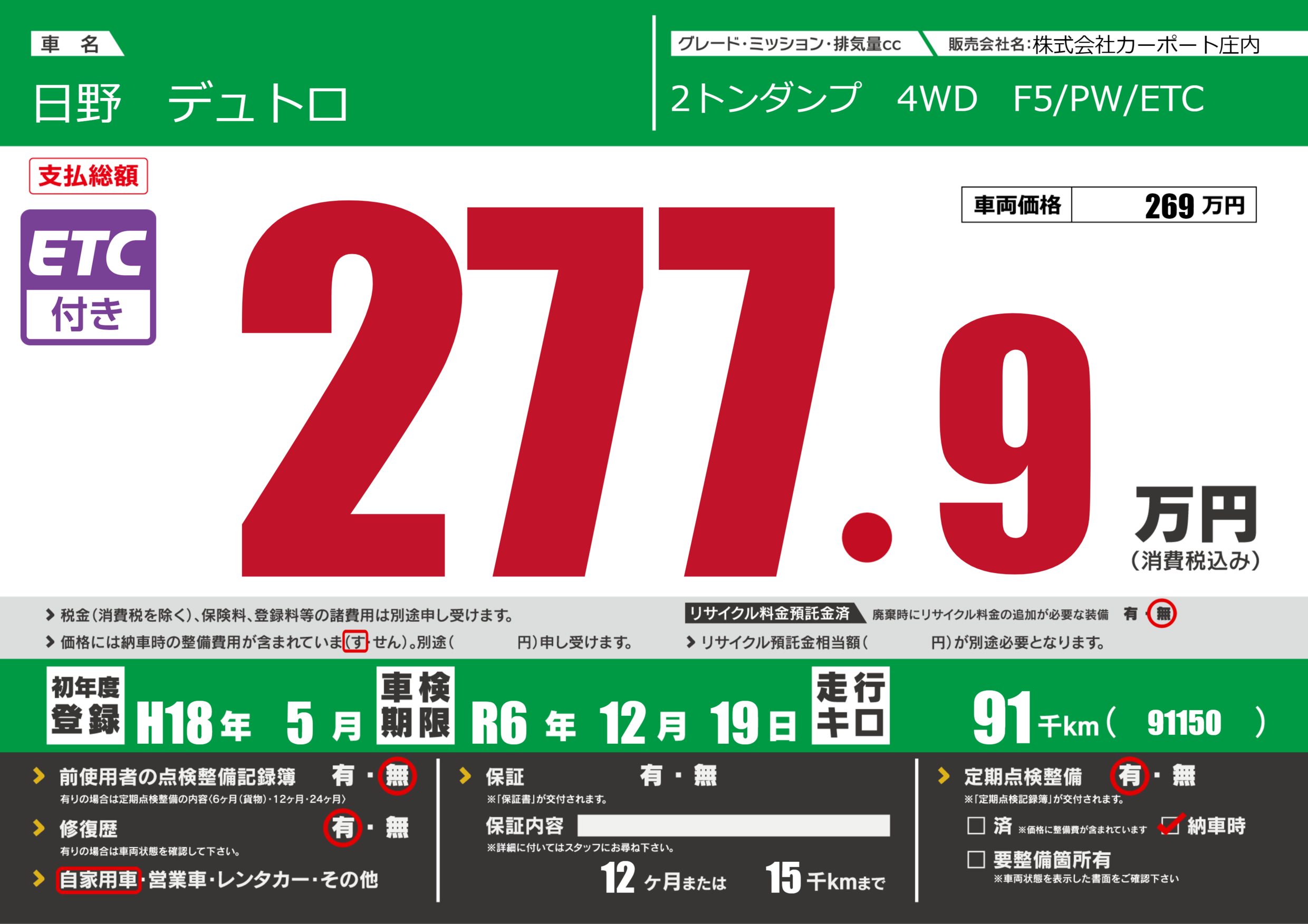 保証なし 保証内容(---) 12ヶ月または(15)千kmまで |