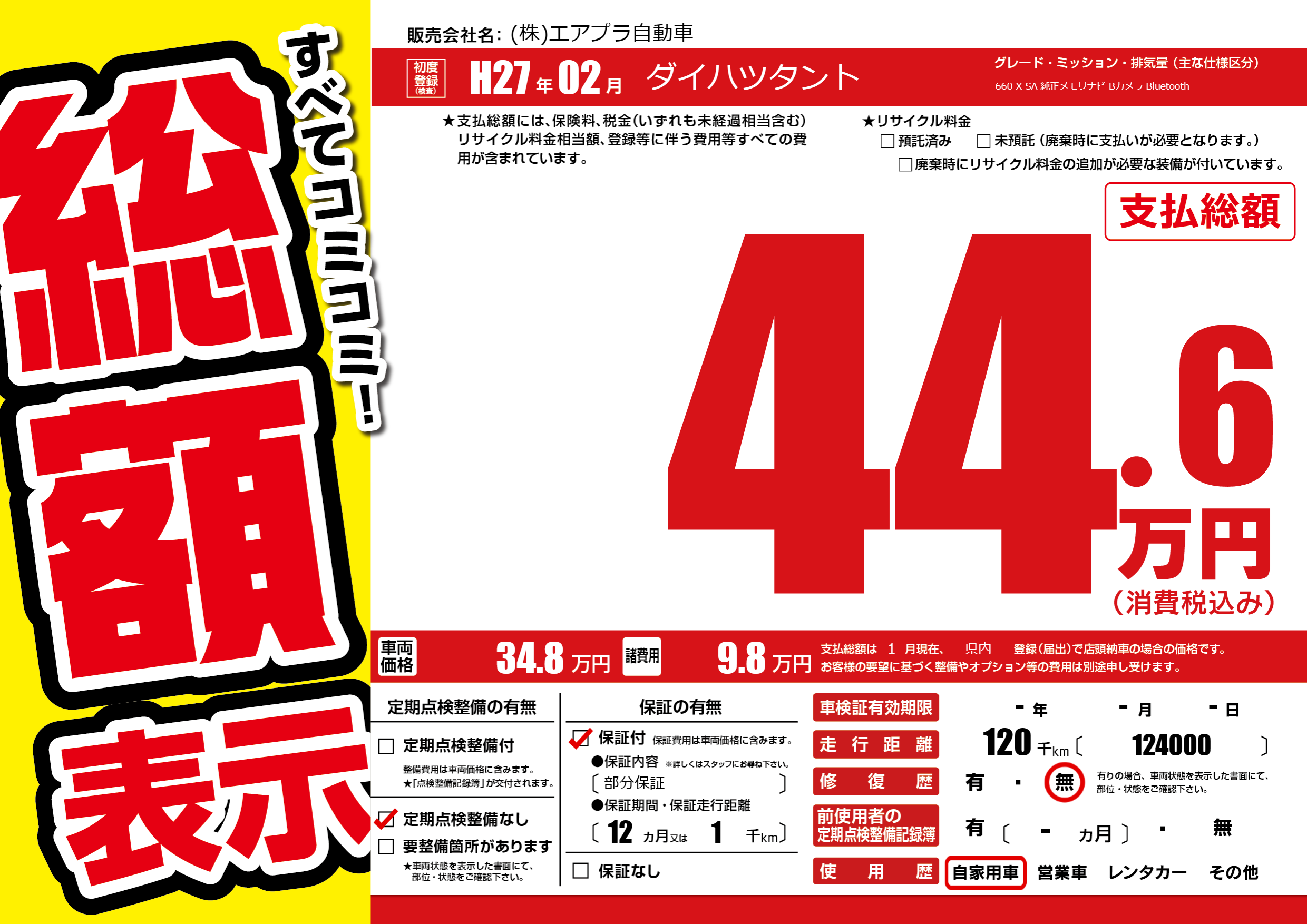 | 走行キロ | 12万km | 初年度登録 | H27年02月 |