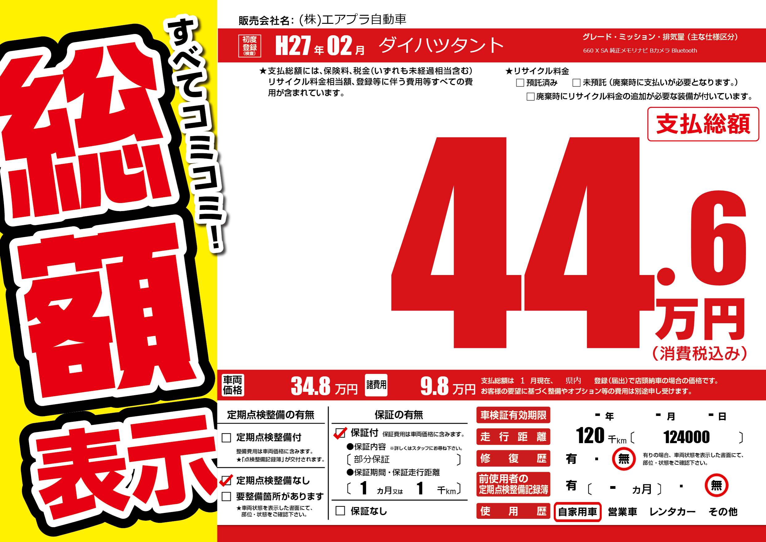 | 車名 | ダイハツタント | グレード ミッション 排気量 |