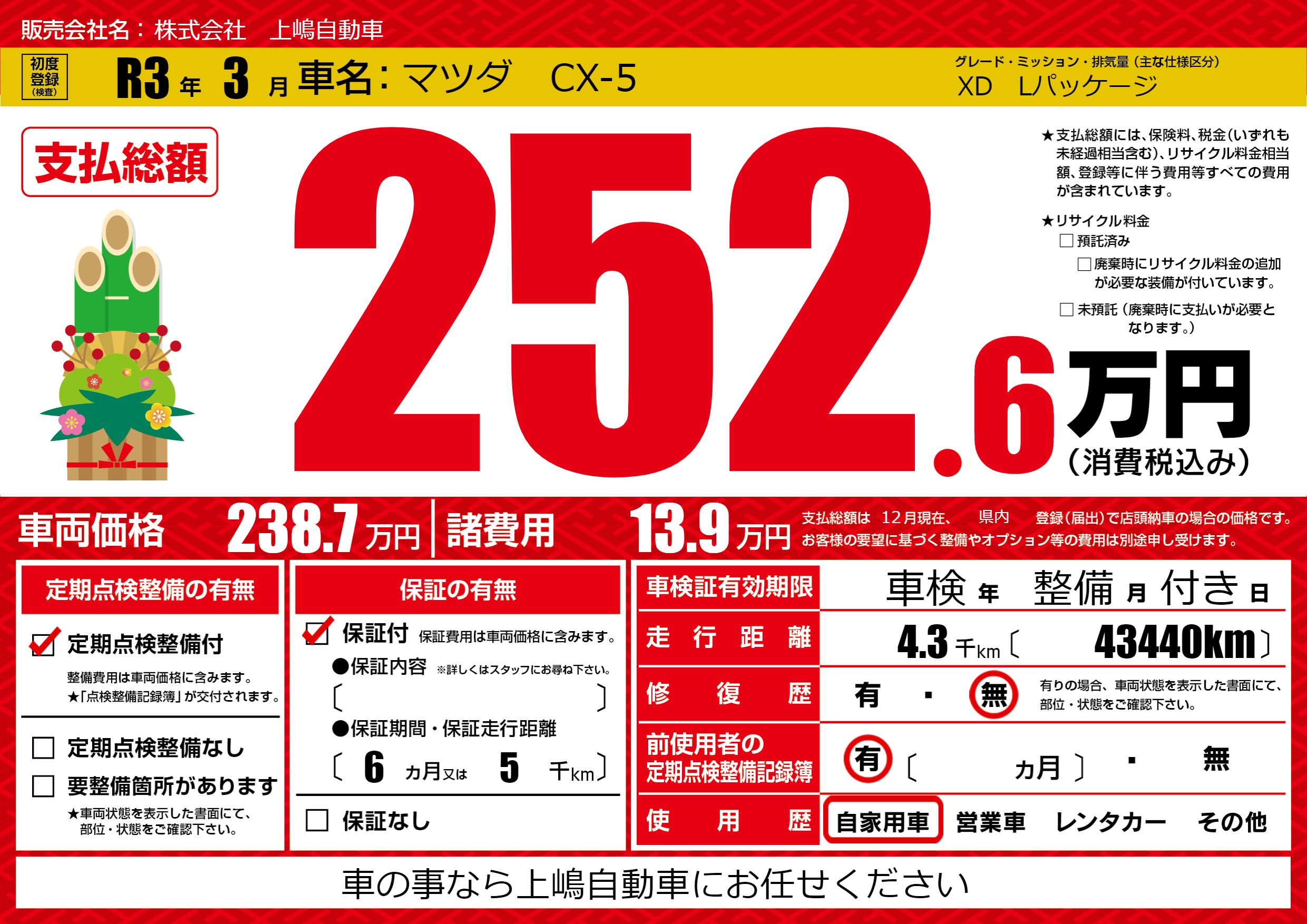 | 車名 | マツダ CX-5 | グレード ミッション 排気量 |