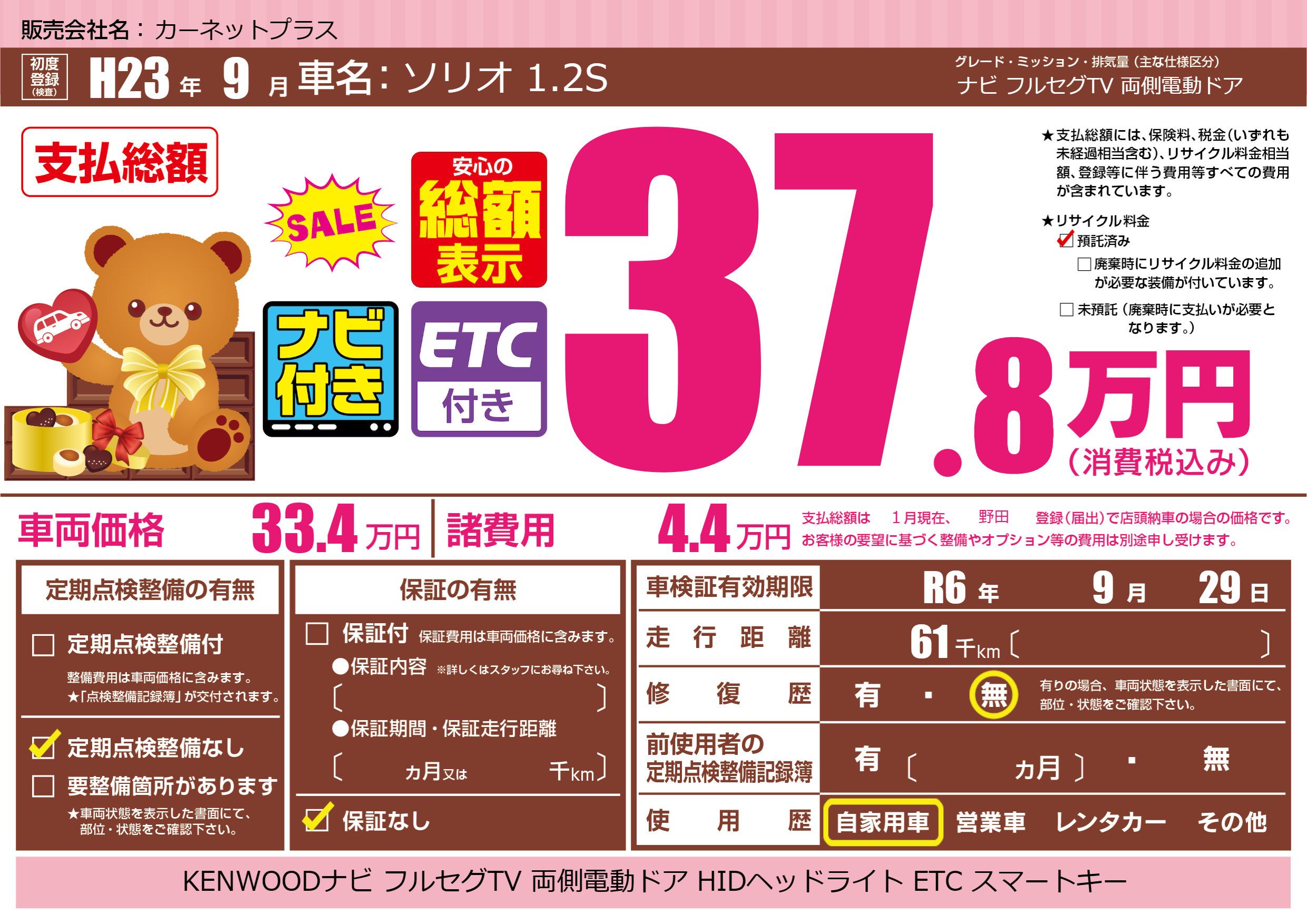 | 車名 | ソリオ 1.2S | グレード ミッション 排気量 |