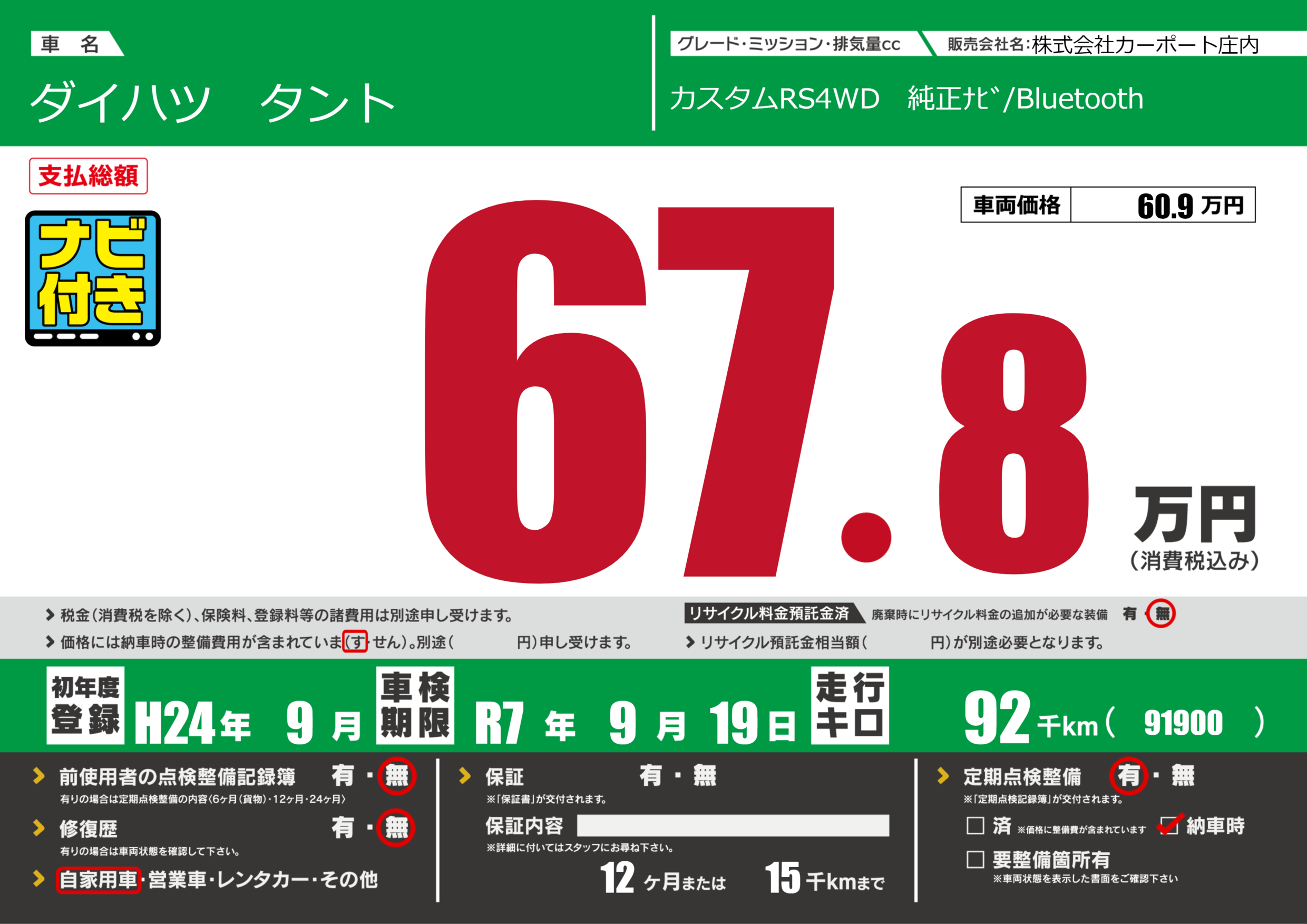 | 車名 | ダイハツ タント | グレード ミッション 排気量 |
