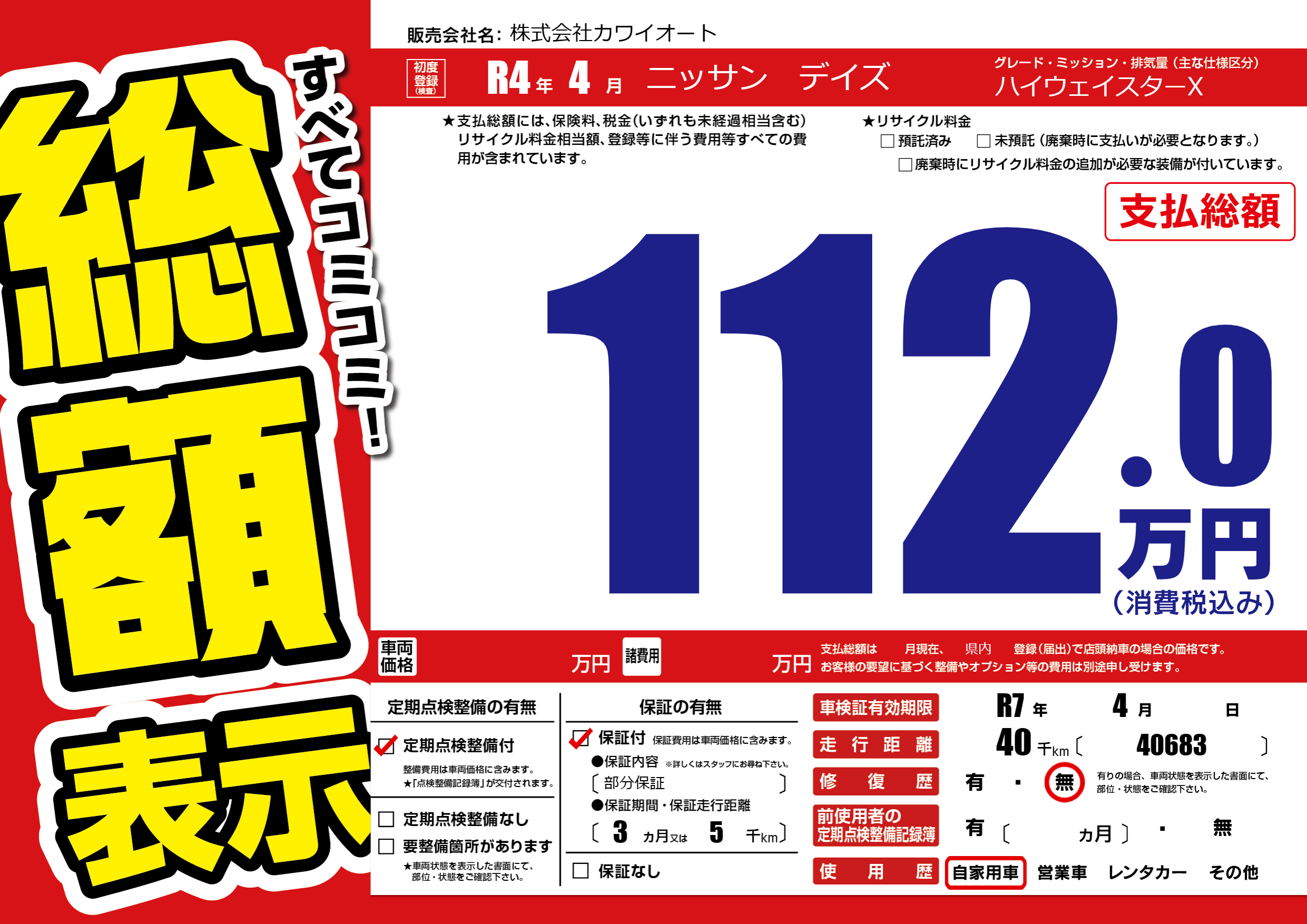 | 車名 | ニッサン デイズ | グレード ミッション 排気量 |